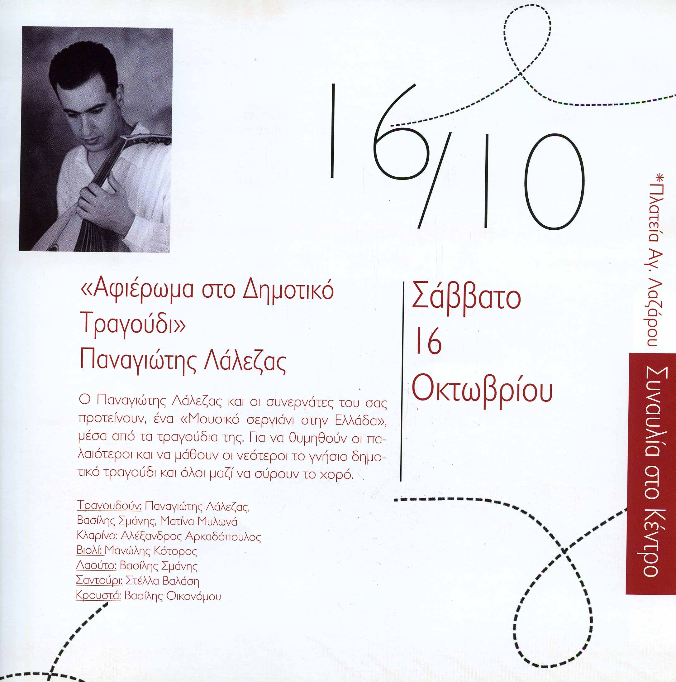 Ο Παναγιώτης Λάλεζας και οι συνεργάτες του σας προτείνουν, ένα «Μουσικό σεργιάνι στην Ελλάδα» , μέσα από τα τραγούδια της, Για να θυμηθούν οι παλαιότεροι και να μάθουν οι νεότεροι το γνήσιο δημοτικό τραγούδι και όλοι μαζί να σύρουν το χορό.