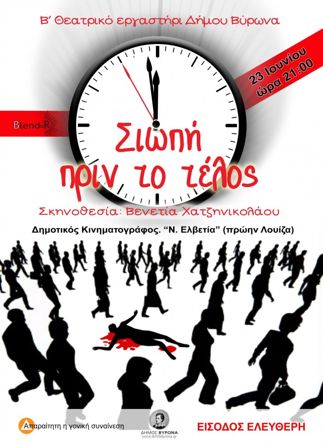 Το Β' θεατρικό εργαστήρι του Δήμου Βύρωνα, παρουσιάζει την παράσταση 'Στιγμή ... πριν το τέλος', το Σάββατο 23 Ιουνίου και ώρα 21.00, στον Δημοτικό Κινηματογράφο «Νέα Ελβετία».