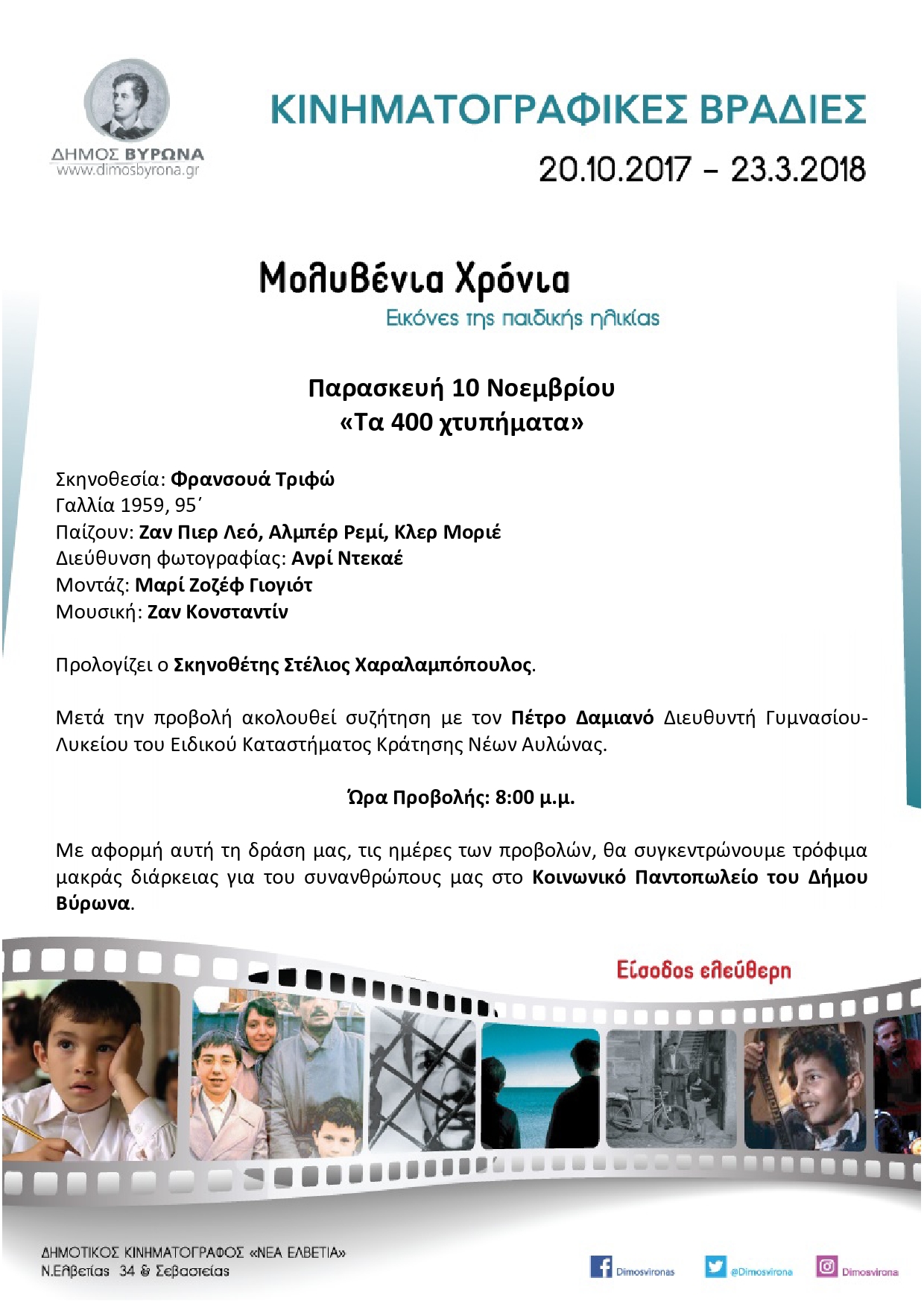 Πλαίσιο Εκδήλωσης: Κινηματογραφικές Βραδιές 2017 – 2018: «Μολυβένια Χρόνια – Εικόνες της παιδικής ηλικίας»