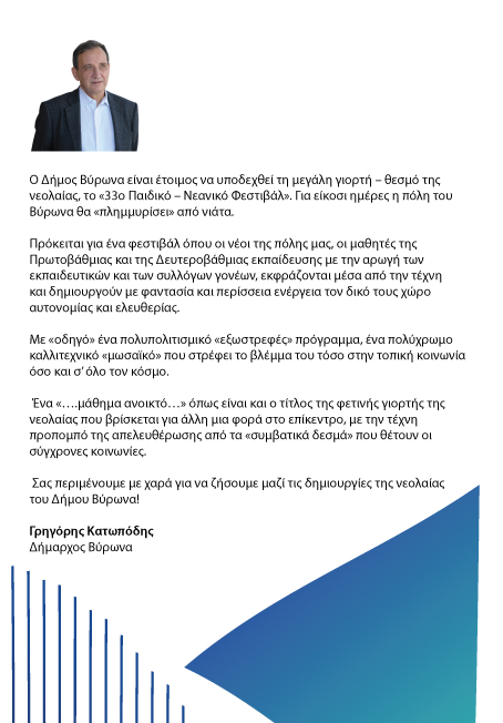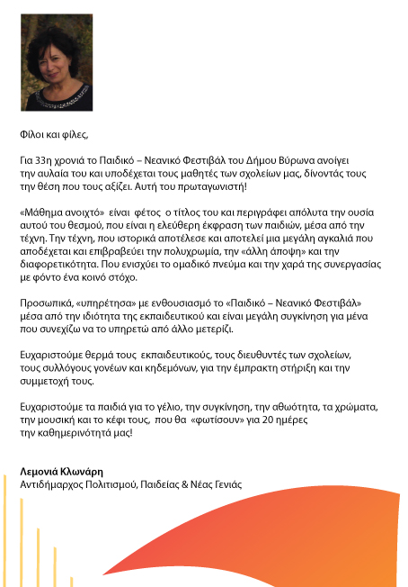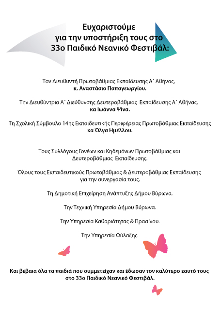ΕΥΧΑΡΙΣΤΙΕΣ Ευχαριστούμε για την υποστήριξη τους στο 33ο Παιδικό Νεανικό Φεστιβάλ: Το Διευθυντή Πρωτοβάθμιας Εκπαίδευσης Α΄ Αθήνας, κ. Αναστάσιο Παπαγεωργίου Τη Διευθύντρια Α΄ Διεύθυνσης Δευτεροβάθμιας Εκπαίδευσης Α΄ Αθήνας, κα Ιωάννα Ψίνα Τη Σχολική Σύμβουλο 14ης Εκπαιδευτικής Περιφέρειας Πρωτοβάθμιας Εκπαίδευσης κα Όλγα Ημέλλου Τους Συλλόγους Γονέων και Κηδεμόνων Πρωτοβάθμιας και Δευτεροβάθμιας Εκπαίδευσης Όλους τους Εκπαιδευτικούς Πρωτοβάθμιας Δευτεροβάθμιας Εκπαίδευσης για την συνεργασία τους Τη Δημοτική Επιχείρηση Ανάπτυξης Δήμου Βύρωνα Τη Τεχνική Υπηρεσία Δήμου Βύρωνα Τη Υπηρεσία Καθαριότητας & Πρασίνου Τη Υπηρεσία Φύλαξης Και βέβαια όλα τα παιδιά που συμμετείχαν και έδωσαν τον καλύτερο εαυτό τους στο 33ο Παιδικό Νεανικό Φεστιβάλ