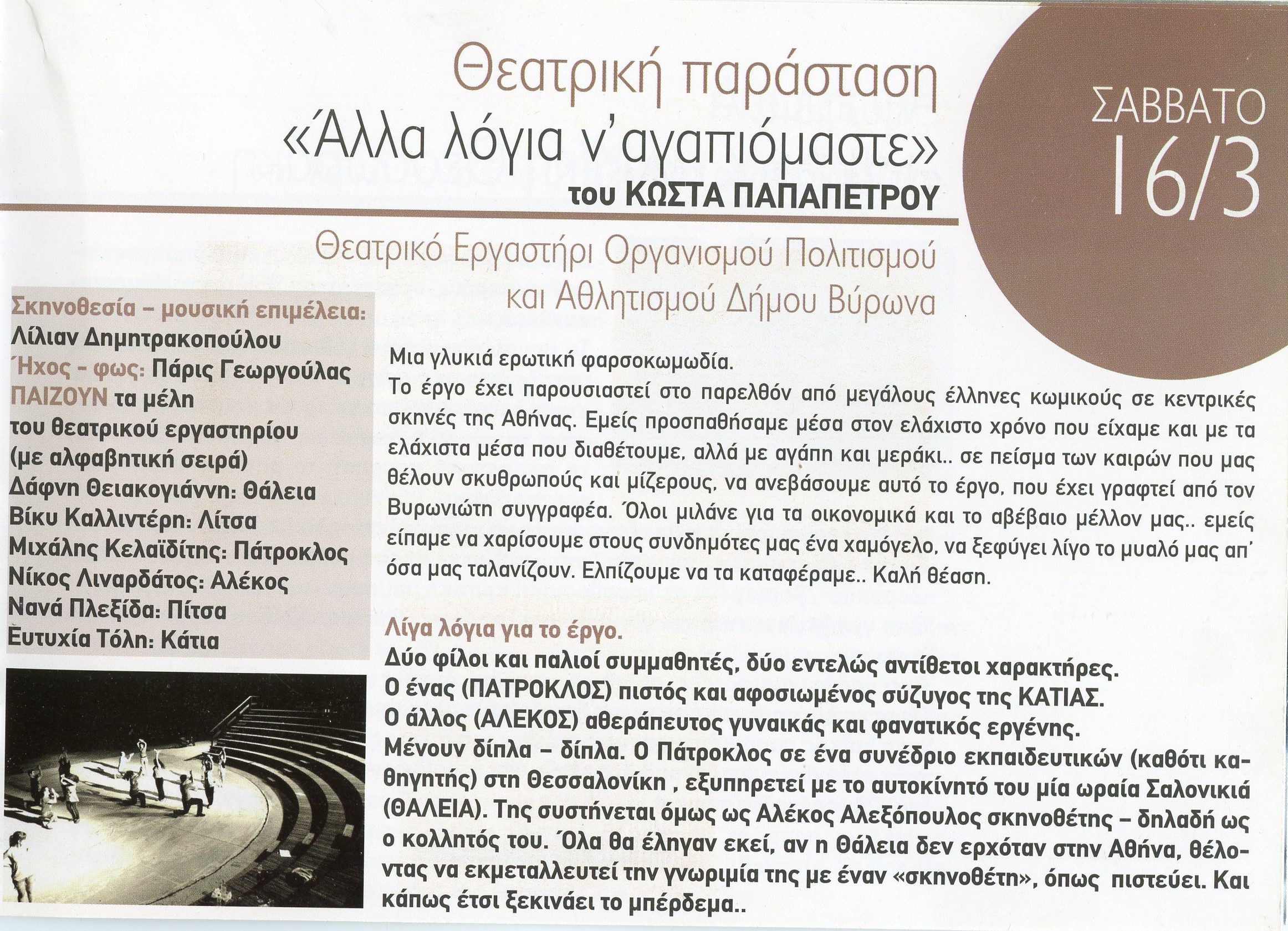 Παίζουν τα μέλη του εργαστηρίου: Θειακογιάννη Δάφνη, Καλλιντέρη Βίκυ, Κελαϊδίτης Μιχάλης, Λιναρδάτος Νίκος, Πλεξίδα Νανά, Τόλη Ευτυχία