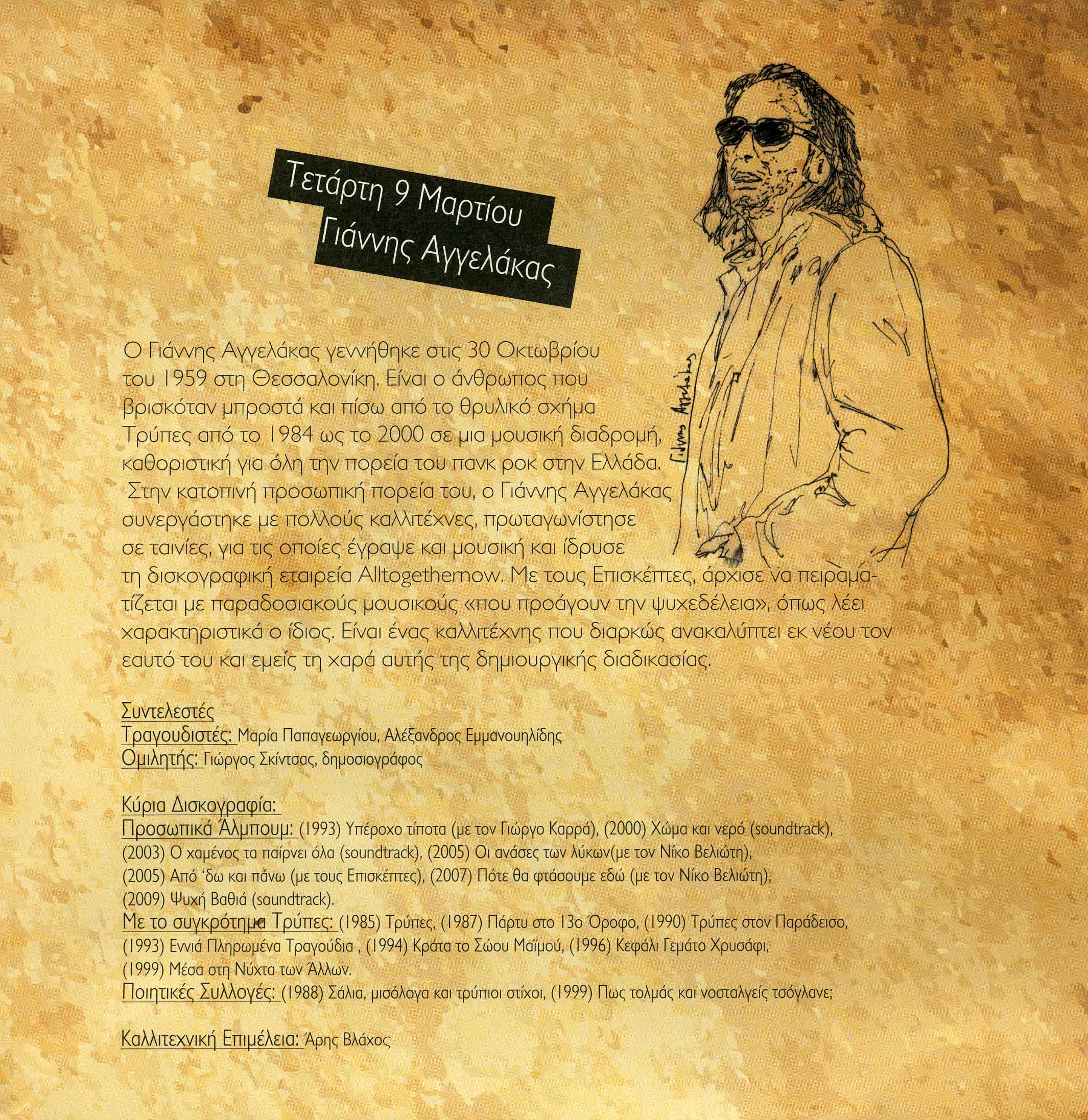Ο Γιάννης Αγγελάκας γεννήθηκε στις 30 Οκτωβρίου του 1959 στη Θεσσαλονίκη. Είναι ο άνθρωπος που βρισκόταν μπροστά και πίσω από το θρυλικό σχήμα Τρύπες από το 1984 ως το 2000 σε μια μουσική διαδρομή, καθοριστική για όλη την πορεία του πανκ ροκ στην Ελλάδα. Στην κατοπινή προσωπική πορεία του, ο Γιάννης Αγγελάκας συνεργάστηκε με πολλούς καλλιτέχνες, πρωταγωνίστησε σε ταινίες, για τις οποίες έγραψε και μουσική και ίδρυσε τη δισκογραφική εταιρεία Altogethemow. Με τους Επισκέπτες, άρχισε να πειραματίζεται με παραδοσιακούς μουσικούς «Που προάγουν την ψυχεδέλεια», όπως λέει χαρακτηριστικά ο ίδιος. Είναι ένας καλλιτέχνης που διαρκώς ανακαλύπτει εκ νέου τον εαυτό του και εμείς τη χαρά αυτής της δημιουργικής διαδικασίας. Κύρια Δισκογραφία: Προσωπικά Άλμπουμ: (1993) Υπέροχο τίποτα (με τον Γιώργο Καρρά), (2000) Χώμα και νερό (soundtrack), (2003) Ο χαμένος τα παίρνει όλα (soundtrack), (2005) Οι ανάσες των λύκων (με τον Νίκο Βελιώτη), (2005) Από 'δω και πάνω (με τους Επισκέπτες), (2007) Πότε θα φτάσουμε εδώ (με τον Νίκο Βελιώτη), (2009) Ψυχή Βαθιά (soundtrack).
