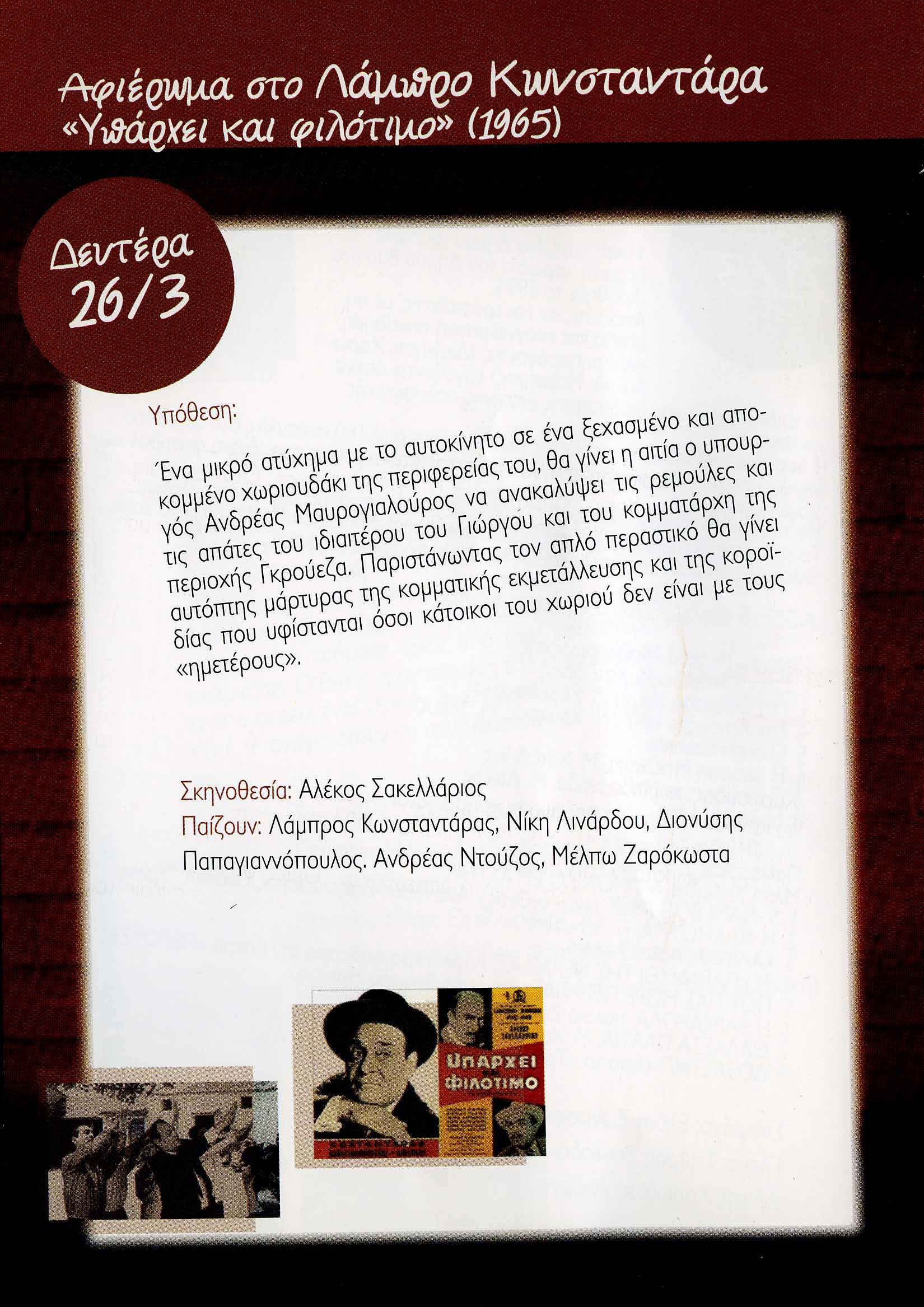 Πλαίσιο Εκδήλωσης: Κινηματογραφικές βραδιές - αφιερώματα σε πρωταγωνιστές του ελληνικού σινεμά