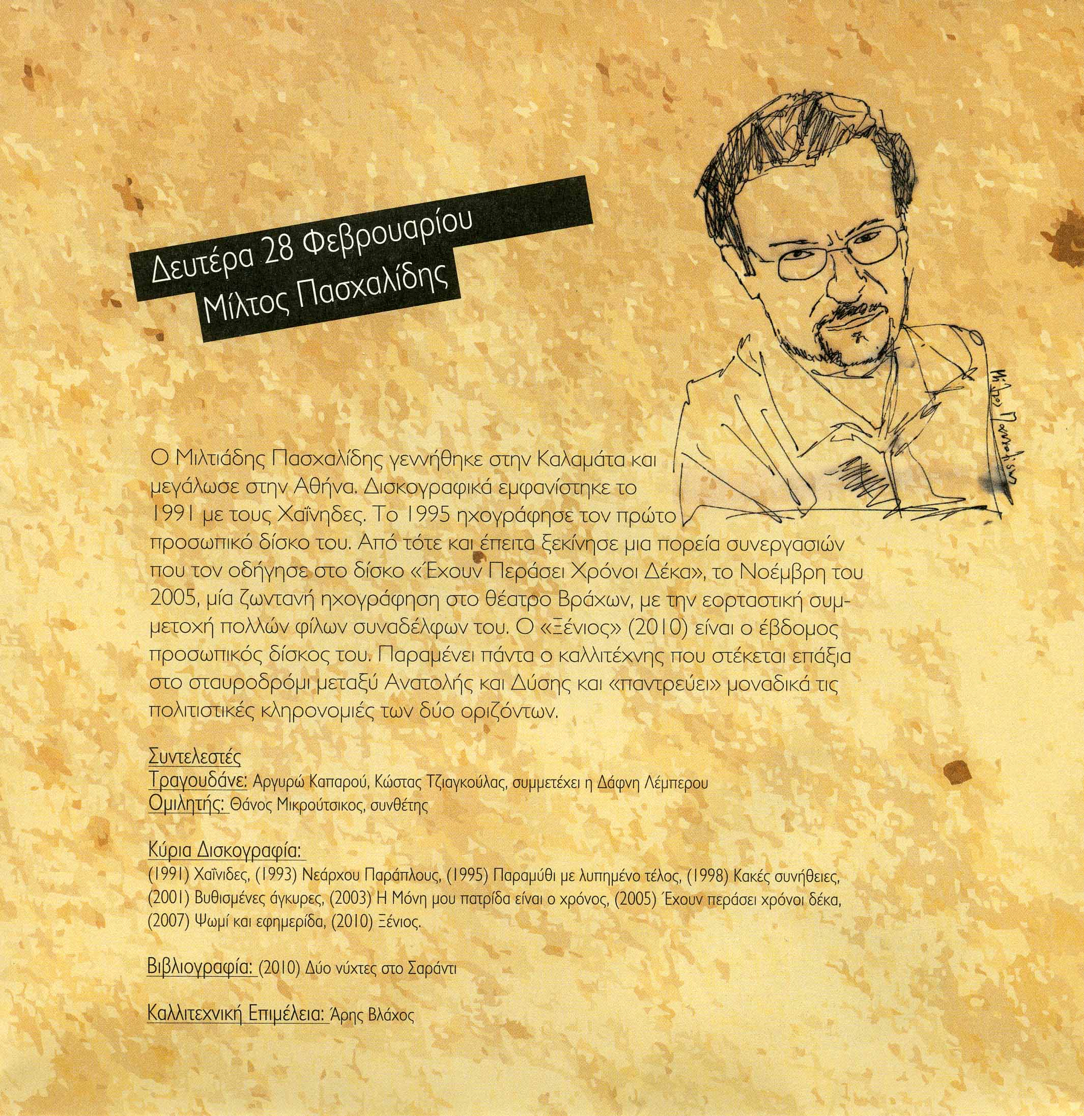 Ο Μιλτιάδης Πασχαλίδης γεννήθηκε στην Καλαμάτα και μεγάλωσε στην Αθήνα. Δισκογραφικά εμφανίστηκε το 1991 με τους Χαΐνηδες. Το 1995 ηχογράφησε τον πρώτο προσωπικό δίσκο του. Από τότε και έπειτα ξεκίνησε μια πορεία συνεργασιών που τον οδήγησε στο δίσκο «Έχουν Περάσει Χρόνοι Δέκα», το Νοέμβρη του 2005, μία ζωντανή ηχογράφηση στο θέατρο Βράχων, με την εορταστική συμμετοχή πολλών φίλων συναδέλφων του. Ο ≪Ξένιος≫ (2010) είναι ο έβδομος προσωπικός δίσκος του. Παραμένει πάντα ο καλλιτέχνης που στέκεται επάξια στο σταυροδρόμι μεταξύ Ανατολής και Δύσης και «παντρεύει» μοναδικά τις πολιτιστικές κληρονομιές των δύο οριζόντων. Κύρια Δισκογραφία: (1991) Χαΐνιδες, (1993) Νεάρχου Παράπλους, (1995) Παραμύθι με λυπημένο τέλος, (1998) Κακές συνήθειες, (2001) Βυθισμένες άγκυρες, (2003) Η Μόνη μου πατρίδα είναι ο χρόνος, (2005) Έχουν περάσει χρόνοι δέκα, (2007) Ψωμί και εφημερίδα, (2010) Ξένιος