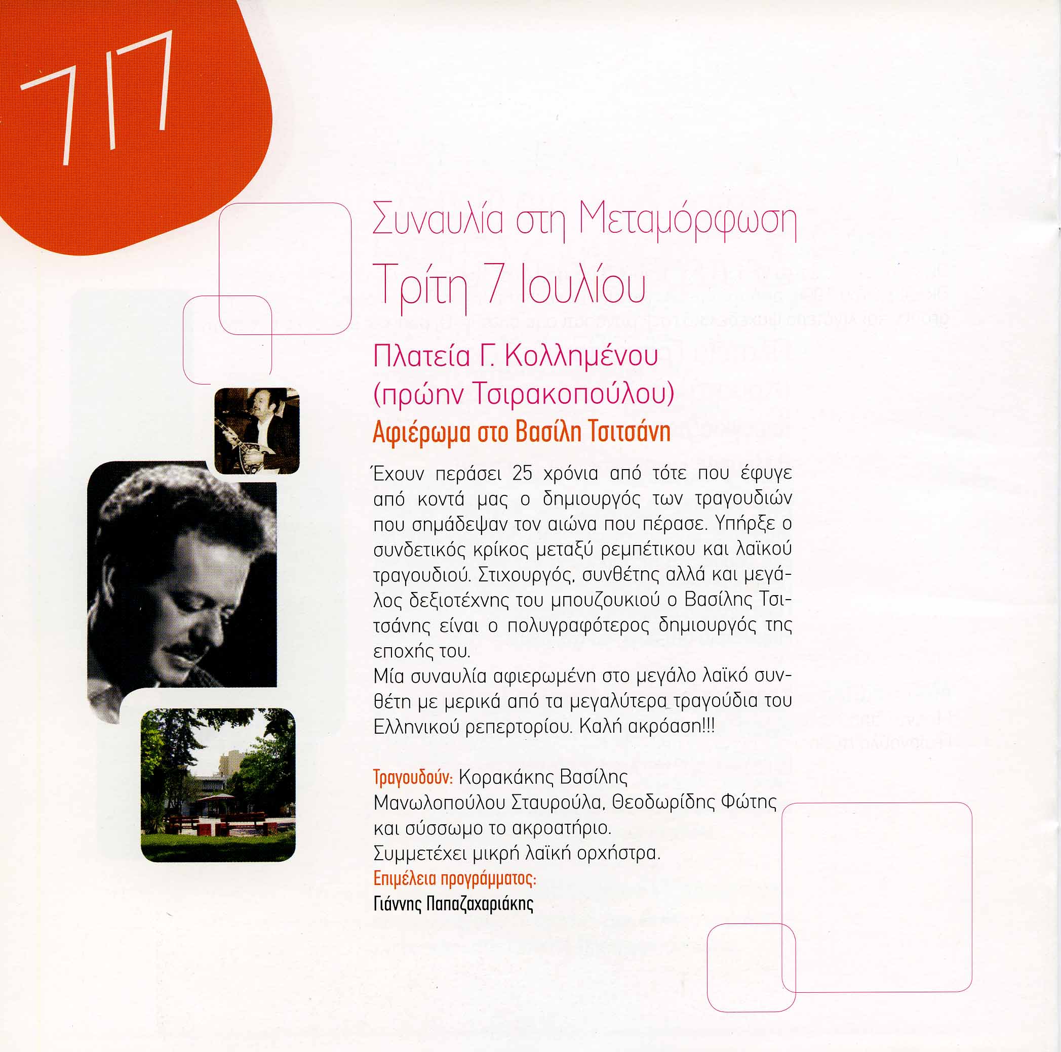 Έχουν περάσει 25 χρόνια από τότε που έφυγε από κοντά μας ο δημιουργός των τραγουδιών που σημάδεψαν τον αιώνα που πέρασε. Υπήρξε ο συνδετικός κρίκος μεταξύ ρεμπέτικου και λαϊκού τραγουδιού. Στιχουργός, συνθέτης αλλά και μεγάλος δεξιοτέχνης του μπουζουκιού ο Βασίλης Τσιτσάνης είναι ο πολυγραφότερος δημιουργός της εποχής του. Μία συναυλία αφιερωμένη στο μεγάλο λαϊκό συνθέτη με μερικά από τα μεγαλύτερα τραγούδια του Ελληνικού ρεπερτορίου.