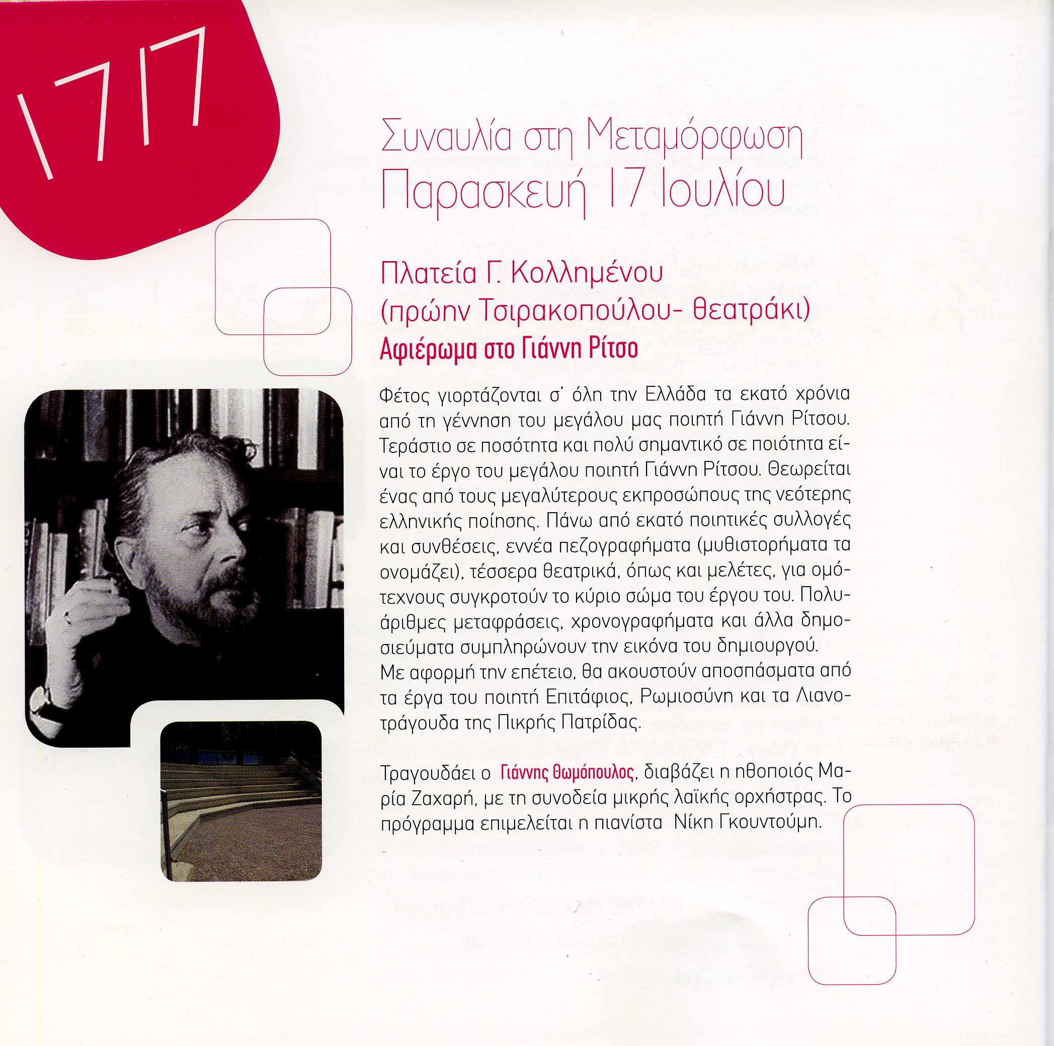 Φέτος γιορτάζονται σ' όλη την Ελλάδα τα εκατό χρόνια από τη γέννηση του μεγάλου μας ποιητή Γιάννη Ρίτσου. Τεράστιο σε ποσότητα και πολύ σημαντικό σε ποιότητα είναι το έργο του μεγάλου ποιητή Γιάννη Ρίτσου. Θεωρείται ένας από τους μεγαλύτερους εκπροσώπους της νεότερης ελληνικής ποίησης. Πάνω από εκατό ποιητικές συλλογές και συνθέσεις, εννέα πεζογραφήματα (μυθιστορήματα τα ονομάζει), τέσσερα θεατρικά, όπως και μελέτες, για ομότεχνους συγκροτούντο κύριο σώμα του έργου του. Πολυάριθμες μεταφράσεις, χρονογραφήματα και άλλα δημοσιεύματα συμπληρώνουν την εικόνα του δημιουργού. Με αφορμή την επέτειο, θα ακουστούν αποσπάσματα από τα έργα του ποιητή Επιτάφιος, Ρωμιοσύνη και τα Λιανοτράγουδα της Πικρής Πατρίδας.
