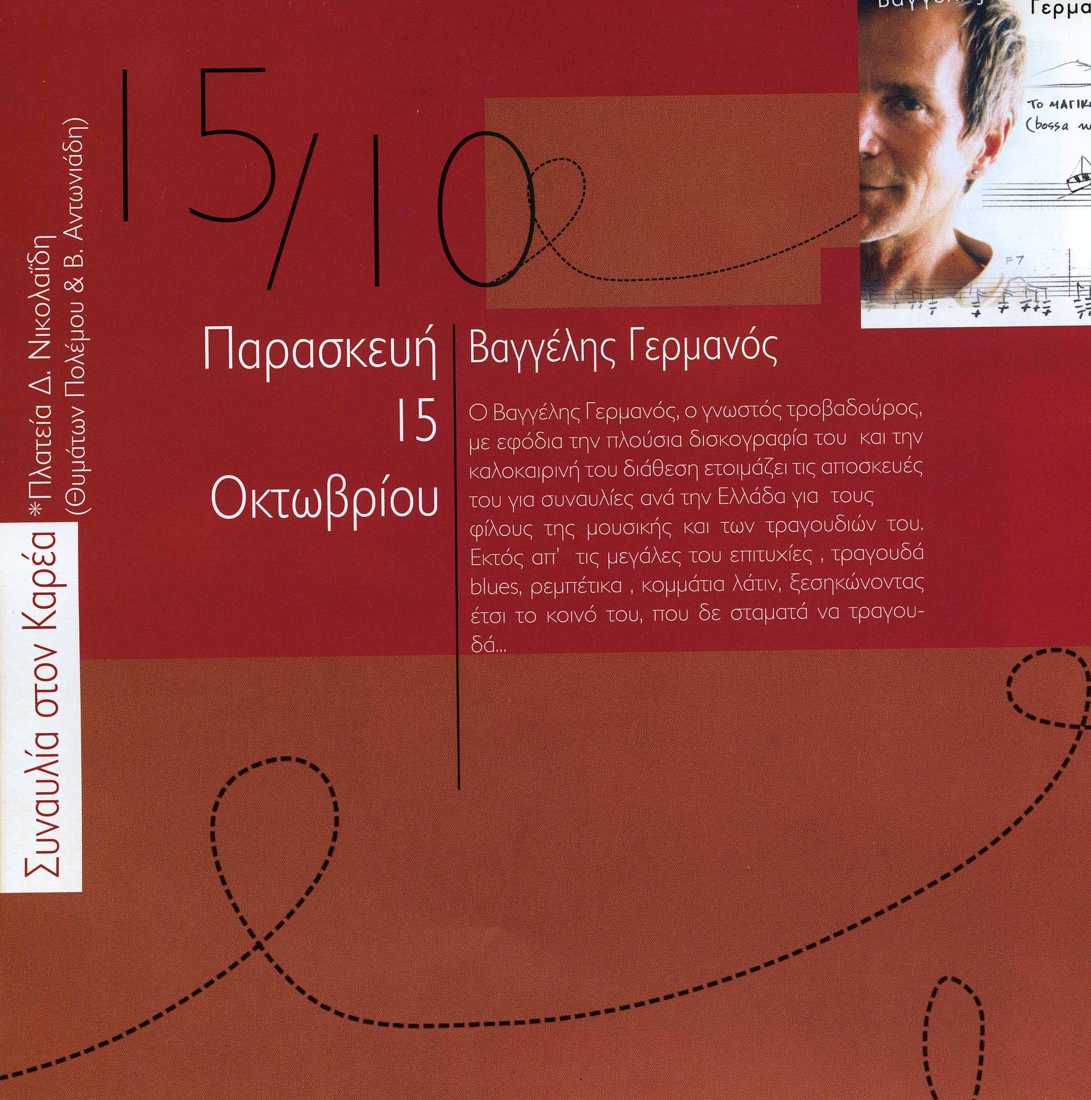 Ο Βαγγέλης Γερμανός, ο γνωστός τροβαδούρος, με εφόδια την πλούσια δισκογραφία του και την καλοκαιρινή του διάθεση ετοιμάζει τις αποσκευές του για συναυλίες ανά την Ελλάδα για τους φίλους της μουσικής και των τραγουδιών του. Εκτός απ’ τις μεγάλες του επιτυχίες , τραγουδά blues, ρεμπέτικα , κομμάτια λάτιν, ξεσηκώνοντας έτσι το κοινό του, που δε σταματά να τραγουδά...