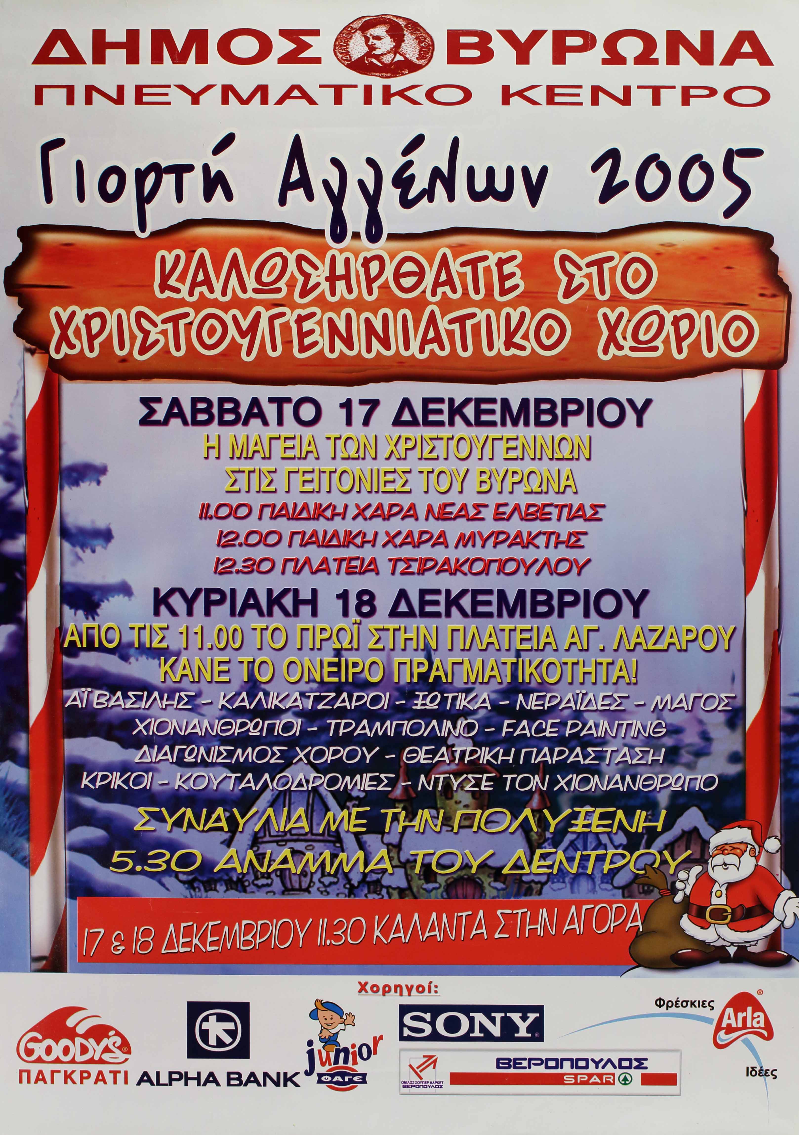 Σάββατο 17 Δεκεμβρίου: Η μαγεία των Χριστουγέννων στις γειτονιές του Βύρωνα. Ο Άγιος Βασίλης παρέα με τον Χιονάνθρωπο και τον Μάγο υποδέχεται τους μικρούς μας φίλους. Πρωτότυπα ομαδικά παιχνίδια, διαγωνισμός χορού και τραγουδιού. Μοναδικές στιγμές με πολλές εκπλήξεις που θα καθηλώσουν μικρούς και μεγάλους διοργανώνονται στην Παιδική Χαρά Νέας Ελβετίας, στην Παιδική Χαρά Μυράκτης, στην Πλατεία Τσιρακοπούλου. Κυριακή 18 Δεκεμβρίου: Ο Αϊ Βασίλης, οι καλικάντζαροι, τα ξωτικά, ο χιονάνθρωπος και οι νεράιδες σας υποδέχονται στα σπιτάκια του χωριού. Ο αρλεκίνος θα σχεδιάσει τα πρόσωπα των μικρών μας φίλων με φανταχτερές φιγούρες. Ελάτε να παίξουμε κουταλοδρομίες, το παιχνίδι των κρίκων και να ντύσουμε όλοι μαζί το Χιονάνθρωπο. Βρείτε το χαμένο θησαυρό. Ο Αϊ Βασίλης χάνει το δρόμο και τα δώρα του …Άραγε θα καταφέρουμε να τον βοηθήσουμε να ξαναβρεί την ευτυχία; Θεατρική παράσταση με πρωταγωνιστές … όλους εσάς! Μοναδικές στιγμές χορού και ξεφαντώματος με την αγαπημένη μας Πολυξένη. Μικροί και μεγάλοι ανάβουμε το δέντρο στο χωριό των Χριστουγέννων (Πλατεία Αγίου Λαζάρου).