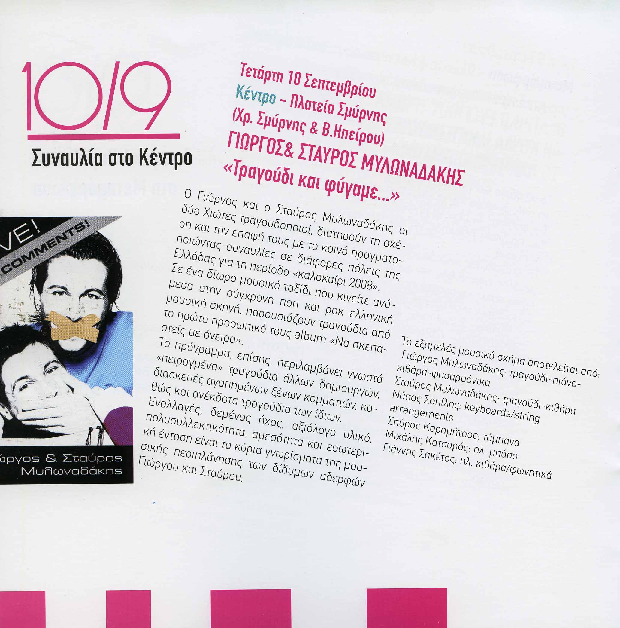 Γιώργος και ο Σταύρος Μυλωναδάκης οι δύο Χιώτες τραγουδοποιοί, διατηρούν τη σχέση και την επαφή τους με το κοινό πραγματοποιώντας συναυλίες σε διάφορες πόλεις της Ελλάδας για τη περίοδο «Καλοκαίρι 2008». Σε ένα δίωρο μουσικό ταξίδι που κινείτε ανάμεσα στην σύγχρονη ποπ και ροκ ελληνική μουσική σκηνή, παρουσιάζουν τραγούδια από το πρώτο προσωπικό τους album «Να σκεπαστείς με όνειρα». Το πρόγραμμα, επίσης, περιλαμβάνει γνωστά «πειραγμένα» τραγούδια άλλων δημιουργών, διασκευές αγαπημένων ξένων κομματιών, καθώς και ανέκδοτα τραγούδια των ίδιων. Εναλλαγές, δεμένος ήχος, αξιόλογο υλικό, πολυσυλλεκτικότητα, αμεσότητα και εσωτερική ένταση είναι τα κύρια γνωρίσματα της μουσικής περιπλάνησης των δίδυμων αδερφών Γιώργου και Σταύρου.