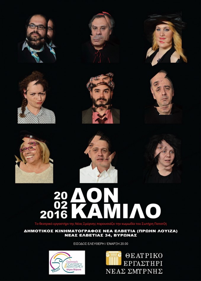 Ύστερα από μία 26ετή πορεία ως σκηνοθέτης της Θεατρικής Ομάδας του Δήμου Νέας Σμύρνης, η κα Κωνσταντίνα Μπελή και τα μέλη της Ομάδας, αποφάσισαν -καθοδηγούμενοι από την κοινή αγάπη για το θέατρο και τη θεατρική έκφραση- να ιδρύσουν εδώ και δύο χρόνια, το Θεατρικό Εργαστήρι Νέας Σμύρνης. Τα μέλη της ομάδας προέρχονται από διάφορους επαγγελματικούς κλάδους και διαθέτουν τον ελεύθερο χρόνο τους σε μια δημιουργική απασχόληση με έντονο το εκφραστικό στοιχείο. Λίγα λόγια για το έργο: Σε ένα μικρό Ιταλικό χωριό, τη δεκαετία του 50, ο εν ενεργεία Δήμαρχος Φλουράτος, του χριστιανοδημοκρατικού κόμματος, διεκδικεί γι’ άλλη μία τετραετία το δημαρχιακό θώκο με αντίπαλο του τον κομμουνιστή υποψήφιο Δήμαρχο, Πεπόνε. Κατόπιν πρωτοβουλιών των ανώτερων εκκλησιαστικών κύκλων, ο αγαθός καθολικός ιερέας Δον Καμίλο, εμπλέκεται στις μηχανορραφίες και τα πολιτικά κόλπα των χριστιανοδημοκρατών, τα αποτελέσματα όμως είναι μέσα από διάφορες κωμικές καταστάσεις, απρόβλεπτα και ανατρεπτικά. Τα πράγματα μπλέκονται περισσότερο, όταν αποκαλύπτεται ότι η ανηψιά του ιερέα, διατηρεί δεσμό με το γιο του πολιτικού αντιπάλου του και παλιού φίλου του Καμίλο, τον Πεπόνε… Οι συντελεστές της παράστασης: Δον Καμίλο: Χρήστος Θεοφίλης, Πεπόνε: Ιπποκράτης Σταμπούλογλου Καρδινάλιος: \tΑλέξανδρος Σαμοϊλης, Κυρία: Εβελίνα Φραγκιαδάκη Aσπασία: Νιόνια Αχτύπη, Φλουράτος: Βασίλης Καραχάλιος Τζούλια: Νίκη Μάμαλη, Mάριο: Βασίλης Λυμπέρης Kαντηλανάφτης: Νατάσσα Παναγιωτίδη, Φωνή: Ευθύμιος Καλομοίρης Μακιγιάζ: Αντωνία Παπαϊωάννου, Υποβολείο: Βίκυ Αναστασοπούλου ΔΗΜΟΤΙΚΟΣ ΚΙΝΗΜΑΤΟΓΡΑΦΟΣ «ΝΕΑ ΕΛΒΕΤΙΑ» (Ν. Ελβετίας 34) Ώρα: 8.00 μ.μ. Είσοδος ελεύθερη