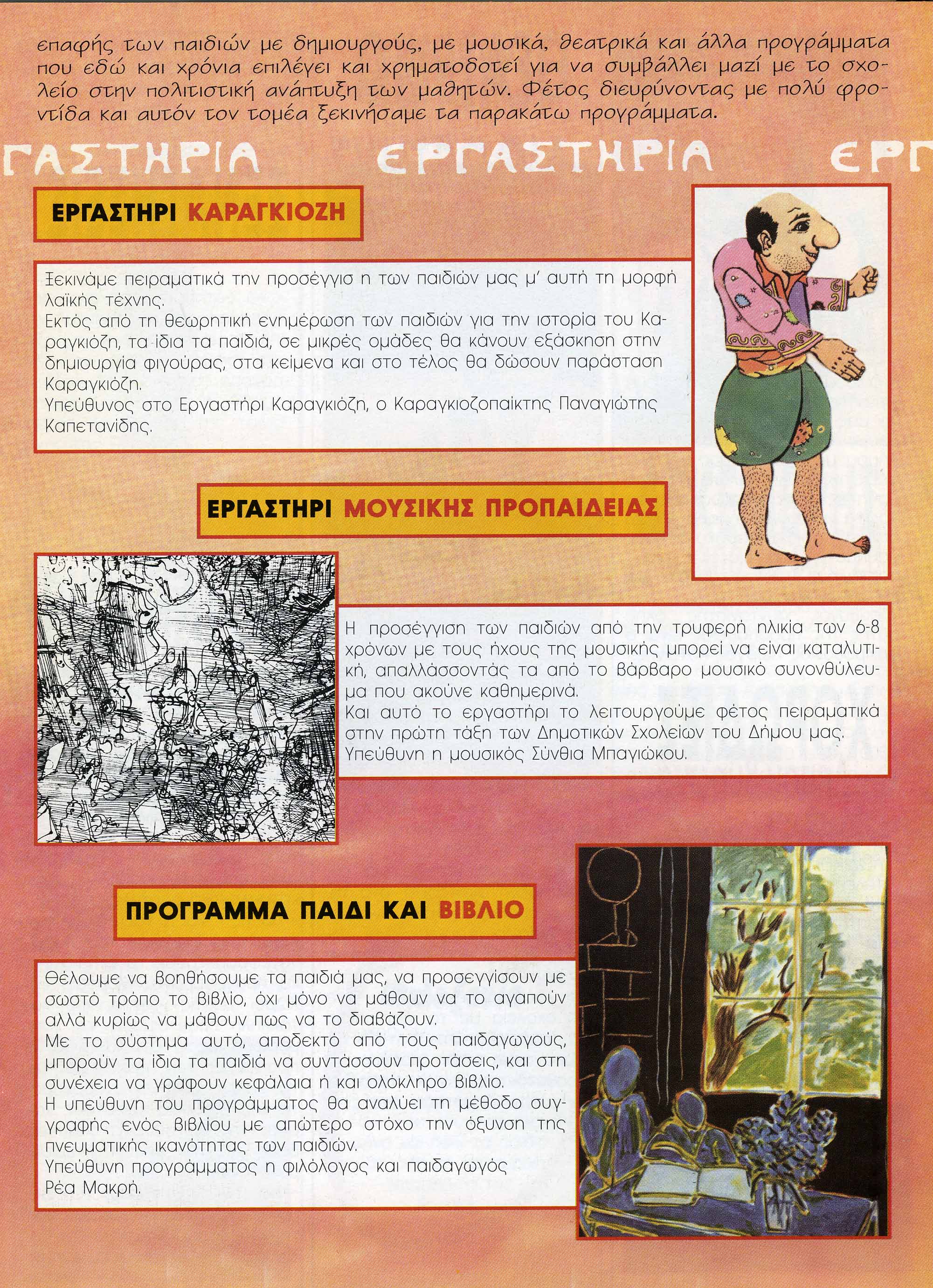 Ξεκινάμε πειραματικά την προσέγγιση των παιδιών μας μ' αυτή τη μορφή λαϊκής τέχνης. Εκτός από τη θεωρητική ενημέρωση των παιδιών για τη ν ιστορία του Καραγκιόζη, τα ίδια τα παιδιά, σε μικρές ομάδες θα κάνουν εξάσκηση στην δημιουργία φιγούρας, στα κείμενα και στο τέλος θα δώσουν παράσταση Καραγκιόζη.
