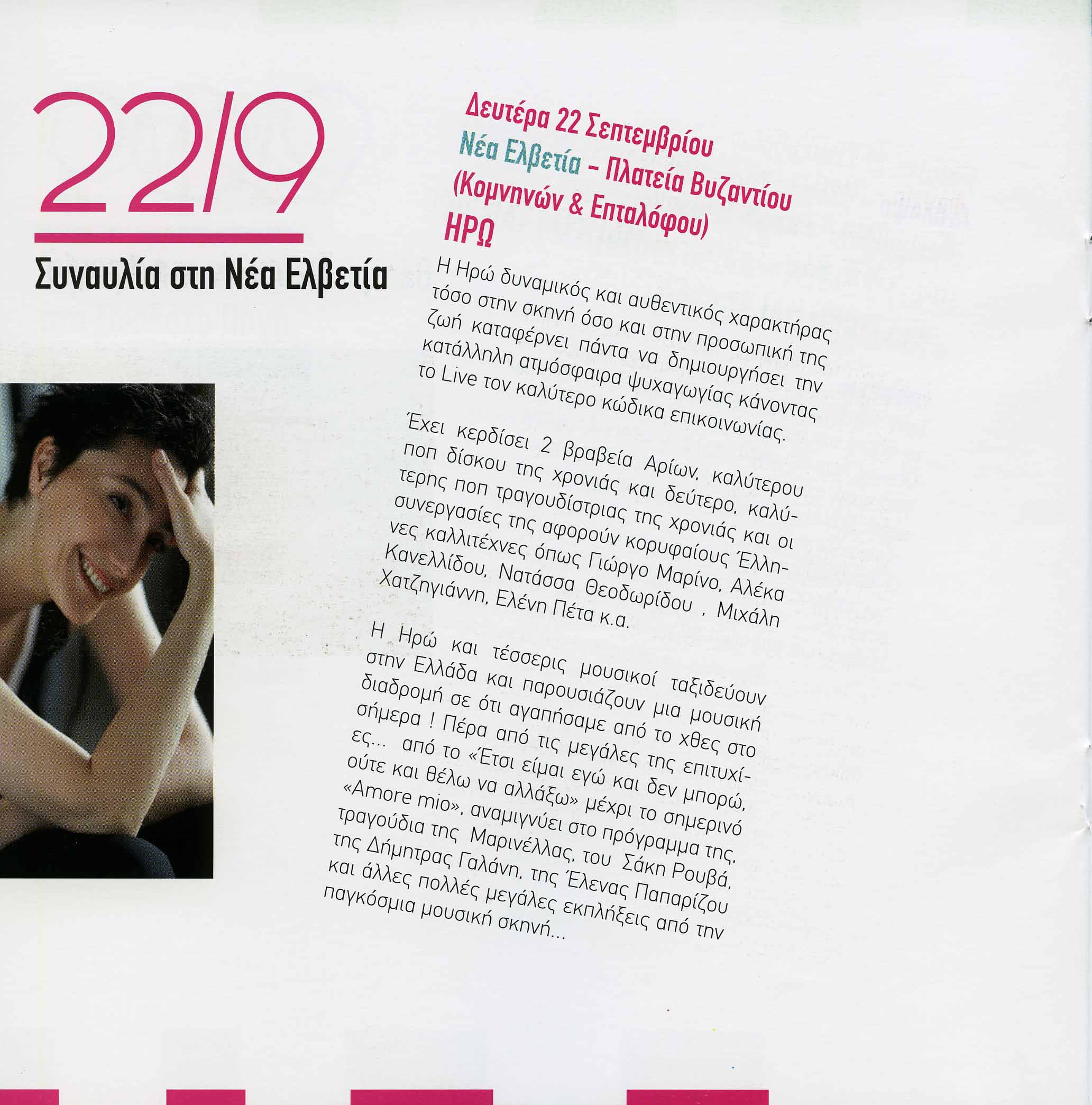 Η Ηρώ δυναμικός και αυθεντικός χαρακτήρας τόσο στην σκηνή όσο και στην προσωπική της ζωή καταφέρνει πάντα να δημιουργήσει την κατάλληλη ατμόσφαιρα ψυχαγωγίας κάνοντας το Live τον καλύτερο κώδικα επικοινωνίας. Έχει κερδίσει 2 βραβεία Αρίων, καλύτερου pop δίσκου της χρονιάς και δεύτερο, καλύτερης pop τραγουδίστριας της χρονιάς και οι συνεργασίες της αφορούν κορυφαίους Έλληνες καλλιτέχνες όπως Γιώργο Μαρίνο, Αλέκα Κανελλίδου, Νατάσσα Θεοδωρίδου , Μιχάλη Χατζηγιάννη, Ελένη Πέτα κ.α. Η Ηρώ και τέσσερις μουσικοί ταξιδεύουν στην Ελλάδα και παρουσιάζουν μια μουσική διαδρομή σε ότι αγαπήσαμε από το χθες στο σήμερα ! Πέρα από τις μεγάλες της επιτυχίες... από το ≪Έτσι είμαι εγώ και δεν μπορώ, ούτε και θέλω να αλλάξω ≫ μέχρι το σημερινό ≪Amore mio≫, αναμιγνύει στο πρόγραμμα της, τραγούδια της Μαρινέλλας, του Σάκη Ρουβά, της Δήμητρας Γαλάνη, της Έλενας Παπαρίζου και άλλες πολλές μεγάλες εκπλήξεις από την παγκόσμια μουσική σκηνή...
