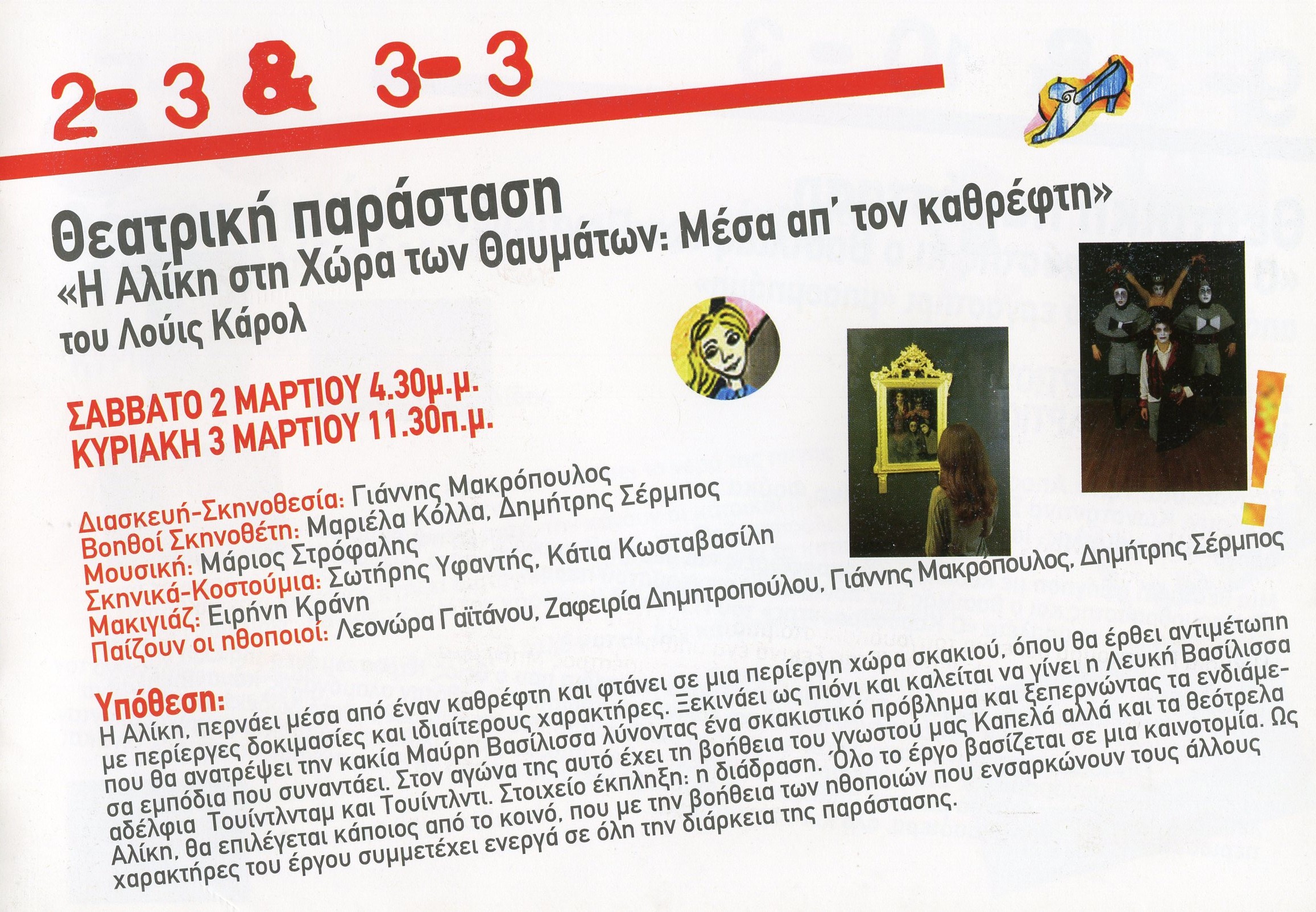 Η Αλίκη περνάει μέσα από έναν καθρέφτη και φτάνει σε μια περίεργη χώρα σκακιού, όπου θα έρθει αντιμέτωπη με περίεργες δοκιμασίες και ιδιαίτερους χαρακτήρες. Ξεκινάει ως πιόνι και καλείται να γίνει η Λευκή Βασίλισσα που θα να ανατρέψει την κακιά Μαύρη Βασίλισσα λύνοντας ένα σκακιστικό πρόβλημα και ξεπερνώντας τα ενδιάμεσα εμπόδια που συναντάει. Στον αγώνα της αυτό έχει τη βοήθεια του γνωστού μας Καπελά αλλά και τα θεότρελα αδέλφια Τουίντλνταμ και Τουίντλντι. Στοιχείο έκπληξη η διάδραση. Όλο το έργο βασίζεται σε μια καινοτομία. Ως Αλίκη θα επιλέγεται κάποιος από το κοινό, που με την βοήθεια των ηθοποιών που ενσαρκώνουν τους άλλους χαρακτήρες του έργου συμμετέχει ενεργά σε όλη την διάρκεια της παράστασης.