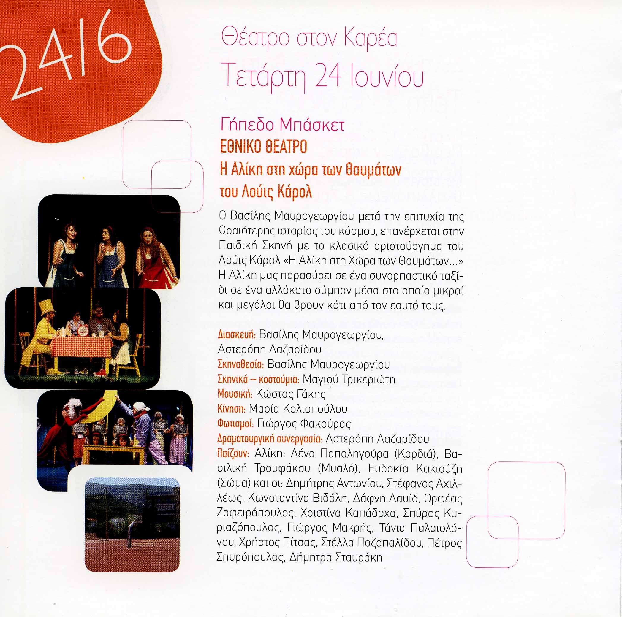 Ο Βασίλης Μαυρογεωργίου μετά την επιτυχία της ωραιότερης ιστορίας του κόσμου, επανέρχεται στην Παιδική Σκηνή με το κλασικό αριστούργημα του Λούις Κάρολ «Η Αλίκη στη Χώρα των θαυμάτων...» Η Αλίκη μας παρασύρει σε ένα συναρπαστικό ταξίδι σε ένα αλλόκοτο σύμπαν μέσα στο οποίο μικροί και μεγάλοι θα βρουν κάτι από τον εαυτό τους.