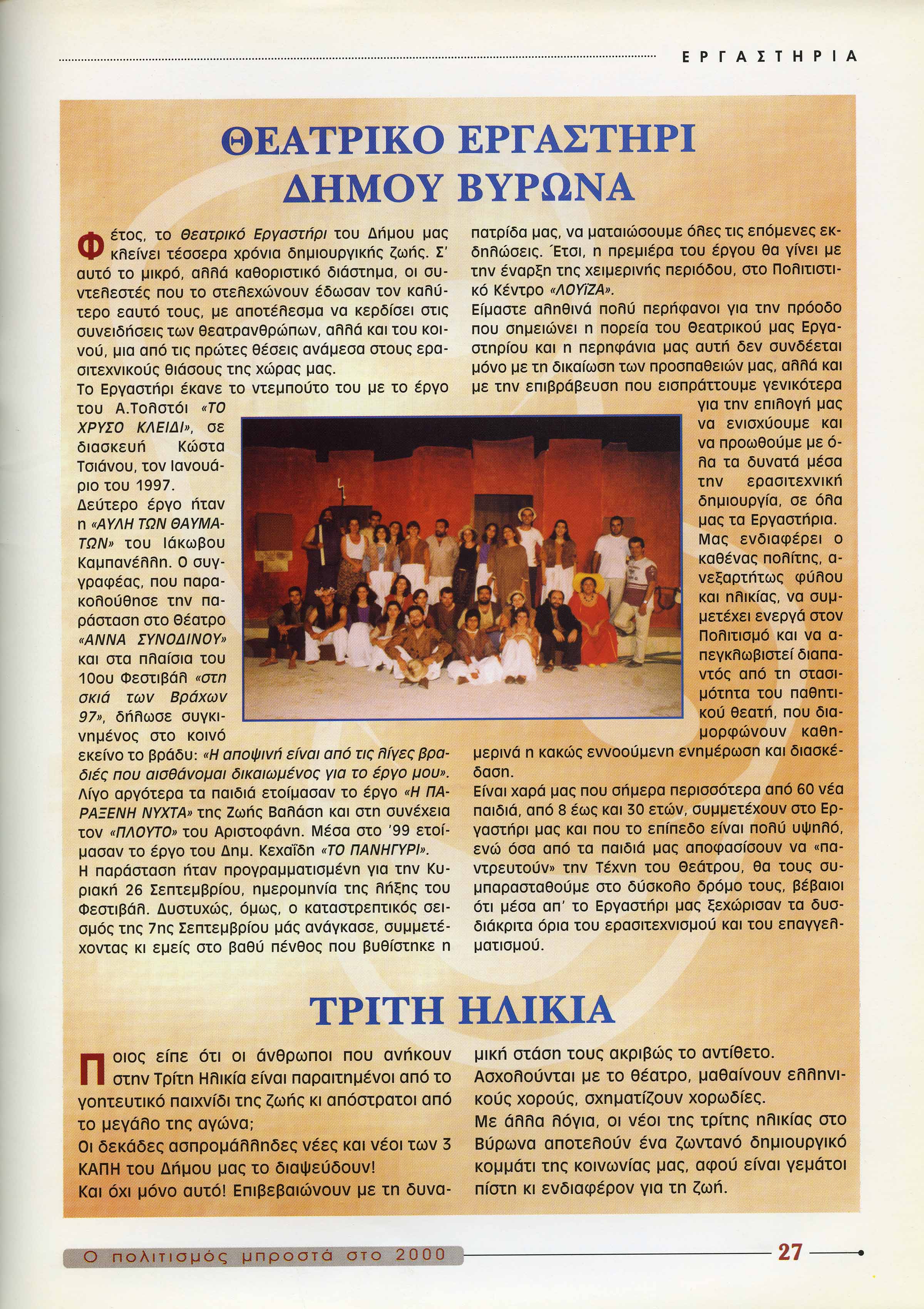 Ποιος είπε ότι οι άνθρωποι που ανήκουν στην Τρίτη Ηλικία είναι παραιτημένοι από το γοητευτικό παιχνίδι της ζωής κι απόστρατοι από το μεγάλο της αγώνα; Οι δεκάδες ασπρομάλληδες νέες και νέοι των 3 ΚΑΠΗ του Δήμου μας το διαψεύδουν! Και όχι μόνο αυτό! Επιβεβαιώνουν με τη δυναμική στάση τους ακριβώς το αντίθετο. Ασχολούνται με το θέατρο, μαθαίνουν ελληνικούς χορούς, σχηματίζουν χορωδίες. Με άλλα λόγια, οι νέοι της τρίτης ηλικίας στο Βύρωνα αποτελούν ένα ζωντανό δημιουργικό κομμάτι της κοινωνίας μας, αφού είναι γεμάτοι πίστη κι ενδιαφέρον για τη ζωή.