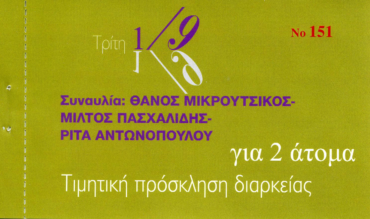 Τρεις άνθρωποι που υπηρετούν το έντεχνο νεοελληνικό τραγούδι, μια από τις σοβαρότερες μορφές τέχνης στον τόπο μας, με συνέπεια και πάθος. Το τραγούδι που εδώ και 50 χρόνια (τρεις γενιές δημιουργών, συνθετών, τραγουδοποιών, ποιητών αλλά και τραγουδιστών) μας χάρισε μοναδικές στιγμές, δίνοντας φωνή στη συνείδηση του λαού, στη συνολική μνήμη του τόπου. Ο Θάνος Μικρούτσικος πιστεύει ότι η κάθε μια απ' αυτές τις γενιές συνεχίζει και διευρύνει το έργο της προηγούμενης. ≪Μόνο έτσι≫, υποστηρίζει, ≪το έντεχνο νεοελληνικό τραγούδι, συνεχίζει την πορεία του μέσα στο χρόνο≫. Και δεν το πιστεύει μόνο, αλλά το κάνει πράξη αφού συνηθίζει να συνεργάζεται με νεότερα πρόσωπα που με το ταλέντο και τη φαντασία τους συνεχίζουν δυναμικά τη γοητευτική περιπέτεια του τραγουδιού στην εποχή μας. Φέτος συνεργάζεται με τον Μίλτο Πασχαλίδη, δημιουργό σημαντικών τραγουδούν με αξιοζήλευτη λαϊκότητα, με τραγούδια σημαίες για τη νέα γενιά. Ο Πασχαλίδης στο πρόγραμμα, εκτός από τις δικές του επιτυχίες, ≪Στα είπα όλα≫, ≪Βυθισμένες άγκυρες≫, ≪Φωτιά μου≫, ≪Κακές συνήθειες≫ αλλά και τραγούδια από την τελευταία του δισκογραφική δουλειά ≪Ψωμί κι εφημερίδα≫, ερμηνεύει με ιδιαίτερο τρόπο τραγούδια του Θάνου Μικρούτσικου που όλοι αγαπήσαμε. Από την άλλη μεριά ο Θάνος Μικρούτσικος, ο συνθέτης της μεταπολίτευσης, ο άνθρωπος που γέννησε τραγούδια τα οποία έγιναν κομμάτι της εθνικής μας κληρονομιάς και συνεχίζει να γράφει με την ίδια συγκίνηση κυνηγώντας πάντα το ≪απρόβλεπτο≫, παρουσιάζει εκτός από Καββαδία, Αλκαίο, Τριπολίτη- σε πρώτη εκτέλεση το νέο του κύκλο τραγουδιών ≪Πάμε ξανά απ' την αρχή≫ σε στίχους Οδυσσέα Ιωάννου. Ερμηνεύτρια η Ρίτα Αντωνοπούλου. βασική του συνεργάτιδα τα τελευταία δύο χρόνια. Μια νέα τραγουδίστρια που όμως έχει κερδίσει το κοινό με τις φωνητικές της ικανότητες, την ερμηνεία της και την ιδιαίτερη σκηνική της παρουσία.