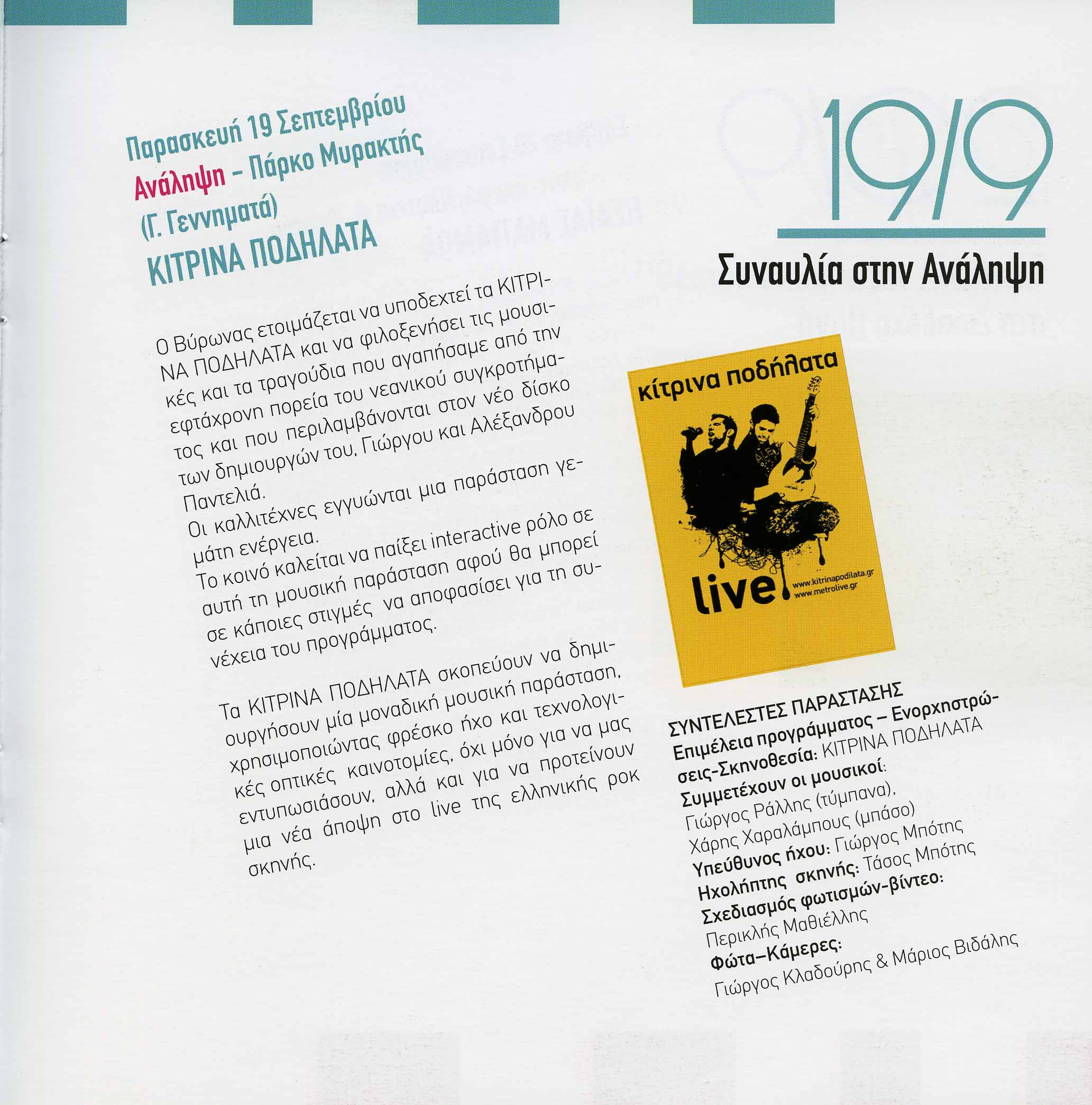 Ο Βύρωνος ετοιμάζεται να υποδεχτεί τα Κίτρινα Ποδήλατα και να φιλοξενήσει τις μουσικές και τα τραγούδια που αγαπήσαμε από την εφτάχρονη πορεία του νεανικού συγκροτήματος και που περιλαμβάνονται στον νέο δίσκο των δημιουργών του, Γιώργου και Αλέξανδρου Παντελιά. Οι καλλιτέχνες εγγυώνται μια παράσταση γεμάτη ενέργεια. Το κοινό καλείται να παίξει interactive ρόλο σε αυτή τη μουσική παράσταση αφού θα μπορεί σε κάποιες στιγμές να αποφασίσει για τη συνέχεια του προγράμματος.Τα Κίτρινα Ποδήλατα σκοπεύουν να δημιουργήσουν μία μοναδική μουσική παράσταση, χρησιμοποιώντας φρέσκο ήχο και τεχνολογικές οπτικές καινοτομίες, όχι μόνο για να μας εντυπωσιάσουν, αλλά και για να προτείνουν μια νέα άποψη στο live της ελληνικής ροκ σκηνής.