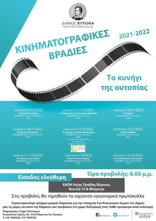 Τις ταινίες προλογίζει ο σκηνοθέτης Στέλιος Χαραλαμπόπουλος και μετά την προβολή ακολουθεί συζήτηση. Παρασκευή 3/12/2021, Συνοικία το όνειρο Σκηνοθεσία: Αλέκος Αλεξανδράκης Σενάριο: Τάσος Λειβαδίτης, Κώστας Κοτζιάς Μουσική: Μίκης Θεοδωράκης Ελληνική ταινία του 1961 με τους Αλέκο Αλεξανδράκη, Μάνο Κατράκη, Αλίκη Γεωργούλη (95΄) Παρασκευή 17/12/2021, Ο άνθρωπος που θα γινόταν βασιλιάς Σκηνοθεσία: Τζον Χιούστον Αμερικάνικη ταινία του 1975 με τους Σον Κόνερι, Μάικλ Κέιν, Κρίστοφερ Πλάμερ (129') Παρασκευή 14/1/2022, Οκτώμισι Σκηνοθεσία: Φεντερίκο Φελίνι Ιταλική ταινία του 1963 με τους Μαρτσέλο Μαστρογιάννι, Κλαούντια Καρντινάλε, Ανούκ Εμέ (138') Παρασκευή 28/1/2022 Επάγγελμα Ρεπόρτερ Σκηνοθεσία: Μικελάντζελο Αντονιόνι Ιταλική ταινία του 1975 με τους Τζακ Νίκολσον, Μαρία Σνάιντερ (119') Παρασκευή 11/2/2022, Το αίνιγμα του Κασπάρ Χάουζερ Σκηνοθεσία: Βέρνερ Χέρτζογκ Γερμανική ταινία του 1974 με τους: Μπρούνο Σ., Βάλτερ Λάντενγκαστ, Μπριγκίτε Μίρα (109'). 'Η προβολή της ταινίας είναι σε συνεργασία με το Goethe-Institut Athen' Παρασκευή 25/2/2022 Ο Χρυσοθήρας Σκηνοθεσία: Τσάρλι Τσάπλιν Αμερικάνικη ταινία του 1925 με τους Τσάρλι Τσάπλιν, Τζόρτζια Χέιλ, Μακ Σουέιν (95') Παρασκευή 11/3/2022 Με κομμένη την ανάσα Σκηνοθεσία: Ζαν Λικ Γκοντάρ Γαλλική ταινία του 1960 με τους Ζαν Πολ Μπελμοντό, Τζίν Σίμπεργκ (90') Παρασκευή 1/4/2022 Πίσω από τους λόφους Σκηνοθεσία: Κριστιάν Μουντζίου Ρουμάνικη ταινία του 2012 με τους Κοσμίνα Στράταν, Κριστίνα Φλουτούρ (150') Παρασκευή 15/4/2022 Το κατά Ματθαίον Ευαγγέλιο Σκηνοθεσία: Πιερ Πάολο Παζολίνι Ιταλική ταινία του 1964 με τους Ενρίκε Ιραζόκουϊ, Μαργκερίτα Καρούζο, Μαρτσέλο Μοράντε (137')