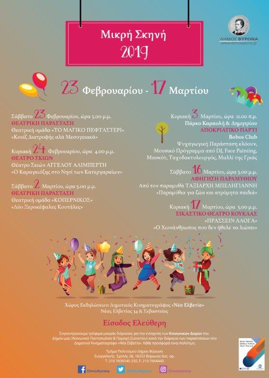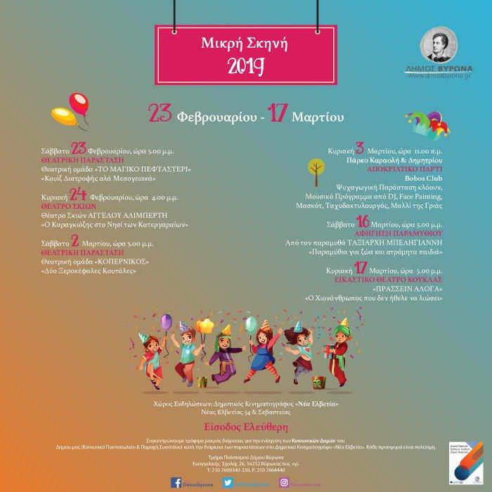 Το συγκινητικό αγκάλιασμα της 'Μικρής σκηνής', από μικρούς και μεγάλους συνδημότες μας, την περσινή χρονιά κατέστησε την επανάληψη και φέτος, επιταγή. Με αφοσίωση στην κοινή παραδοχή ότι τα παιδιά είναι προτεραιότητα μας και την πεποίθηση ότι ο πολιτισμός είναι ο δρόμος καλλιέργειας του πνεύματος, σας παρουσιάζουμε το πλουσιότερο φετινό πρόγραμμα. Ελπίζουμε να το αγκαλιάσετε με την ίδια θέρμη... Καλή διασκέδαση! 23 Φεβρουαρίου - 17 Μαρτίου Χώρος εκδηλώσεων: Δημοτικός Κινηματογράφος «Νέα Ελβετία», Νέας Ελβετίας 34 & Σεβαστείας. Είσοδος Ελεύθερη. Συγκεντρώνουμε τρόφιμα μακράς διαρκείας για την ενίσχυση των Κοινωνικών Δομών του Δήμου μας (Κοινωνικό Παντοπωλείο & Παροχή Συσσιτίου) κατά την διάρκεια των παραστάσεων στο Δημοτικό Κινηματογράφο 'Νέα Ελβετία'. Κάθε προσφορά είναι πολύτιμη. Σάββατο 23 Φεβρουαρίου, ώρα 5.00 μ.μ. ΘΕΑΤΡΙΚΗ ΠΑΡΑΣΤΑΣΗ. Θεατρική ομάδα 'ΤΟ ΜΑΓΙΚΟ ΠΕΦΤΑΣΤΕΡΙ'. 'Κουίζ Διατροφής αλά Μεσογειακά' Κυριακή 24 Φεβρουαρίου, ώρα 4.00 μ.μ. ΘΕΑΤΡΟ ΣΚΙΩΝ. Θέατρο Σκιών ΑΓΓΕΛΟΥ ΑΛΙΜΠΕΡΤΗ. 'Ο Καραγκιόζης στο Νησί των Κατεργαραίων' Σάββατο 2 Μαρτίου, ώρα 5.00 μ.μ. ΘΕΑΤΡΙΚΗ ΠΑΡΑΣΤΑΣΗ. Θεατρική ομάδα 'ΚΟΠΕΡΝΙΚΟΣ'. 'Δύο Ξεροκέφαλες Κουτάλες'. Κυριακή 3 Μαρτίου, ώρα 11.00 π. μ. Πάρκο Καραολή & Δημητρίου ΑΠΟΚΡΙΑΤΙΚΟ ΠΑΡΤΙ Bobos Club Ψυχαγωγική Παράσταση κλόουν, Μουσικό Πρόγραμμα από DJ, Face Painting, Μασκότ, Ταχυδακτυλουργός, Μαλλί της Γριάς Σάββατο 16 Μαρτίου, ώρα 5.00 μ.μ. ΑΦΗΓΗΣΗ ΠΑΡΑΜΥΘΙΟΥ Από τον παραμυθά ΤΑΞΙΑΡΧΗ ΜΠΕΛΗΓΙΑΝΝΗ. 'Παραμύθια για ζώα και ατρόμητα παιδιά' Κυριακή 17 Μαρτίου, ώρα 5.00 μ.μ. ΕΙΚΑΣΤΙΚΟ ΘΕΑΤΡΟ ΚΟΥΚΛΑΣ 'ΠΡΑΣΣΕΙΝ ΑΛΟΓΑ'. 'Ο Χιονάνθρωπος που δεν ήθελε να λιώσει'