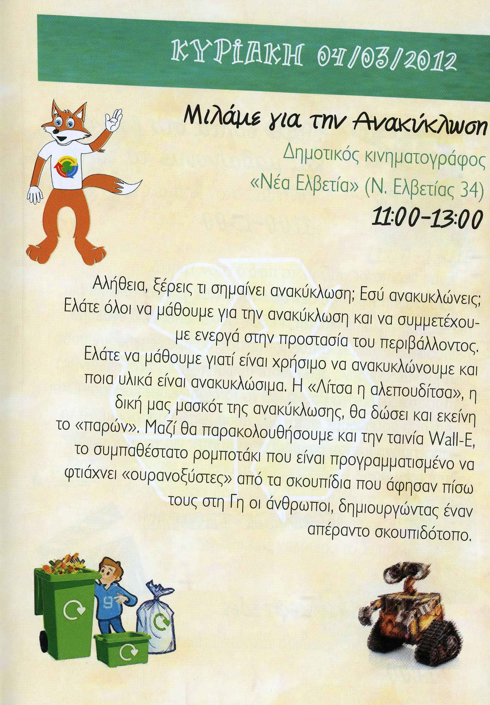 Αλήθεια, ξέρεις τι σημαίνει ανακύκλωση; Εσύ ανακυκλώνεις; Ελάτε όλοι να μάθουμε για την ανακύκλωση και να συμμετέχουμε ενεργά στην προστασία του περιβάλλοντος. Ελάτε να μάθουμε γιατί είναι χρήσιμο να ανακυκλώνουμε και ποια υλικά είναι ανακυκλώσιμα. Η « Λίτσα η αλεπουδίτσα” , η δική μας μασκότ της ανακύκλωσης, θα δώσει και εκείνη το παρών” . Μαζί θα παρακολουθήσουμε και την ταινία Wall-E, το συμπαθέστατο ρομποτάκι που είναι προγραμματισμένο να φτιάχνει “ ουρανοξύστες” από τα σκουπίδια που άφησαν πίσω τους στη Γη οι άνθρωποι, δημιουργώντας έναν απέραντο σκουπιδότοπο.