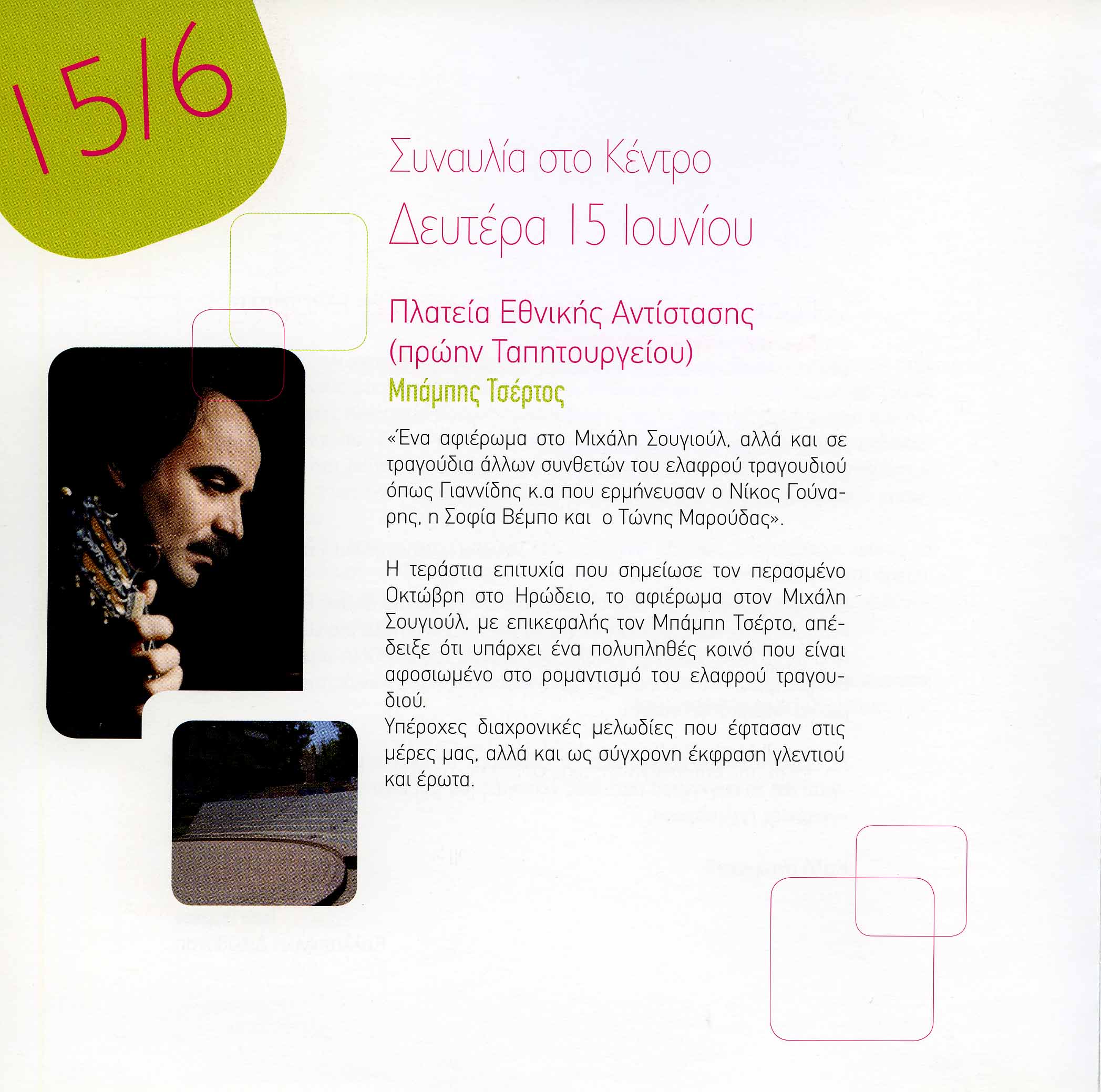 Ένα αφιέρωμα στο Μιχάλη Σουγιούλ, αλλά και σε τραγούδια άλλων συνθετών του ελαφρού τραγουδιού όπως Γιαννίδης κ.ά. που ερμήνευσαν ο Νίκος Γούναρης, η Σοφία Βέμπο και ο Τώνης Μαρούδας. Η τεράστια επιτυχία που σημείωσε τον περασμένο Οκτώβρη στο Ηρώδειο, το αφιέρωμα στον Μιχάλη Σουγιούλ. Με επικεφαλής τον Μπάμπη Τσέρτο, απέδειξε ότι υπάρχει ένα πολυπληθές κοινό που είναι αφοσιωμένο στο ρομαντισμό του ελαφρού τραγουδιού. Υπέροχες διαχρονικές μελωδίες που έφτασαν στις μέρες μας. αλλά και ως σύγχρονη έκφραση γλεντιού και έρωτα.