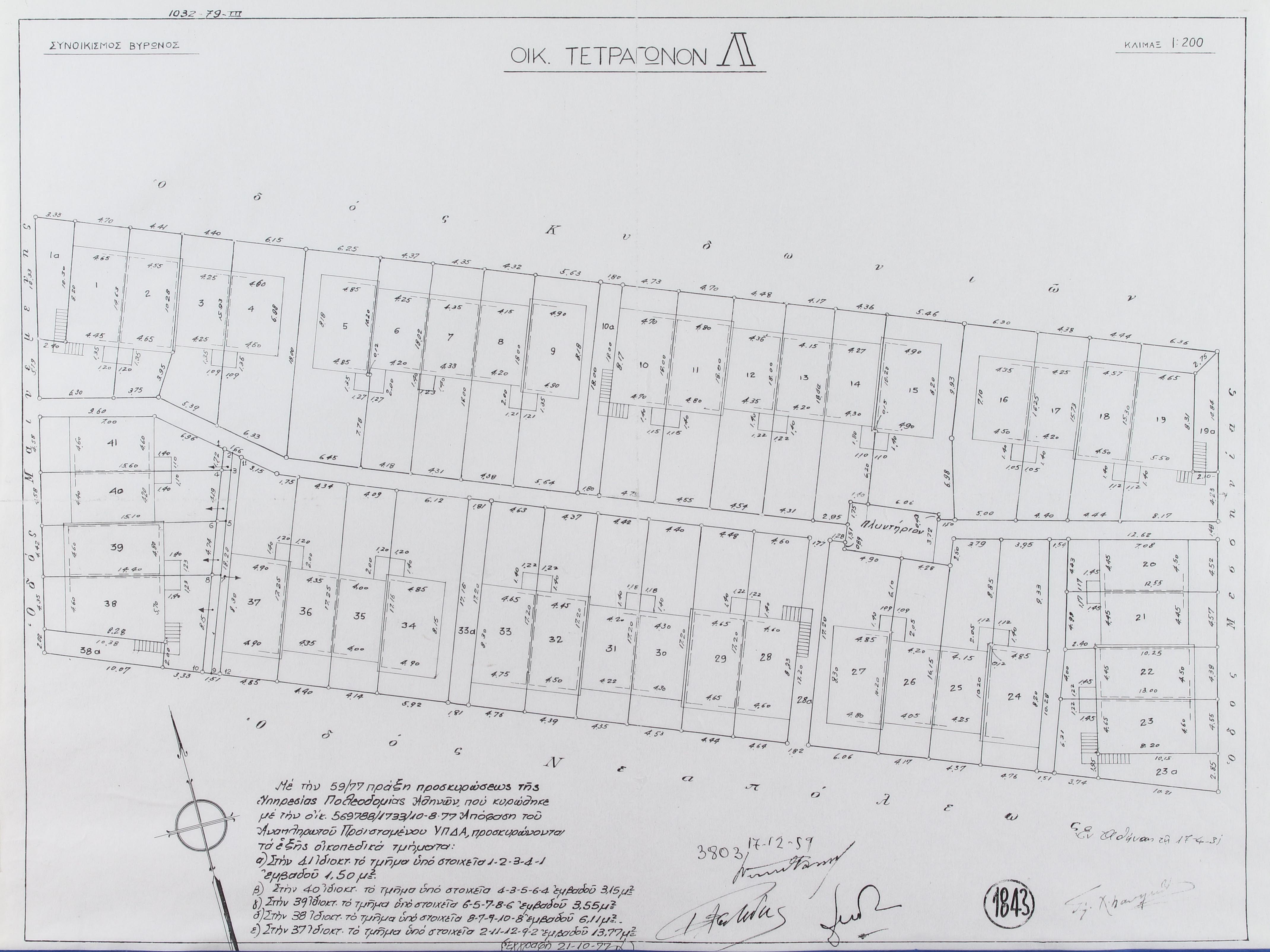 Με την 59/77 πράξη προσκυρώσεως της Υπηρεσίας Πολεοδομίας Αθηνών, που κυρώθηκε με την οικ. 569788/1733/10-8-77 Απόφαση του Αναπληρωτού Προϊσταμένου ΥΠΔΑ, προσκυρώνονται τα εξής οικοπεδικά τμήματα: α) Στην 41 ιδιοκτ. το τμήμα υπό στοιχεία 1-2-3-4-1 εμβαδού 1,50 μ². β) Στην 40 ιδιοκτ. το τμήμα υπό στοιχεία 4-3-5-6-4 εμβαδού 3,15 μ². γ) Στην 39 ιδιοκτ. το τμήμα υπό στοιχεία 6-5-7-8-6 εμβαδού 3,55 μ². δ)Στην 38 ιδιοκτ. το τμήμα υπό στοιχεία 8-7-9-10-8 εμβαδού 6,11 μ². ε) Στην 37 ιδιοκτ. το τμήμα υπό στοιχεία 2-11-12-9-2 εμβαδού 13,77 μ².