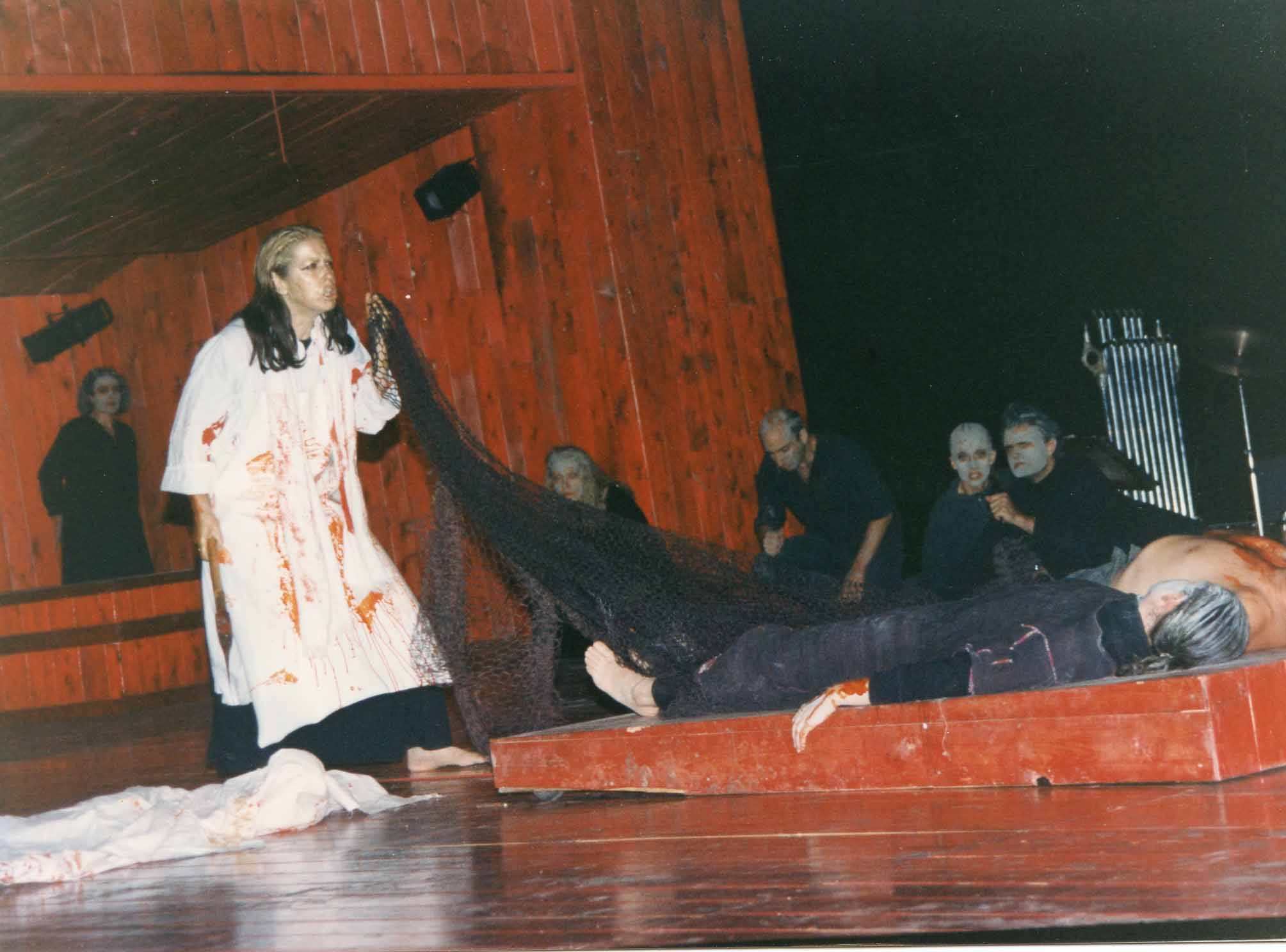 Φύλακας: Δημήτρης Γιαννόπουλος, Κλυταιμνήστρα: Μαριέττα Σγουρδαίου, Κήρυκας: Γιάννης Μαυριτσάκης, Αγαμέμνων: Μηνάς Χατζησάββας, Κασσάνδρα: Ντίνα Μιχαηλίδη, Αίγισθος: Κώστας Φαλελάκης, Ορέστης: Ζαχαρίας Ρόχας, Πυλάδης: Μανώλης Σειραγάκης, Ηλέκτρα: Χρύσα Σπηλιώτη, Τροφός: Μπέλλα Μπερδούση, Οικέτης: Δημήτρης Γιαννόπουλος, Προφήτισσα: Χριστίνα Σιμοπούλου, Απόλλων: Κώστας Γαλανάκης, Αθηνά: Ανθή Ανδρεοπούλου