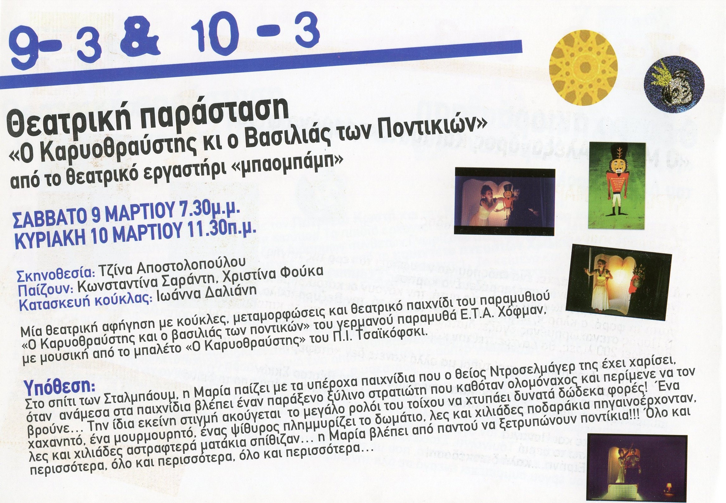 Μια θεατρική αφήγηση με κούκλες μεταμορφώσεις και θεατρικό παιχνίδι του παραμυθιού «Ο Καρυοθραύστης και ο βασιλιάς των ποντικιών» του γερμανού παραμυθά Ε. Τ. Α. Χόφμαν με μουσική από το μπαλέτο «Ο Καρυοθραύστης» του Π. Ι. Τσαϊκόφσκι.