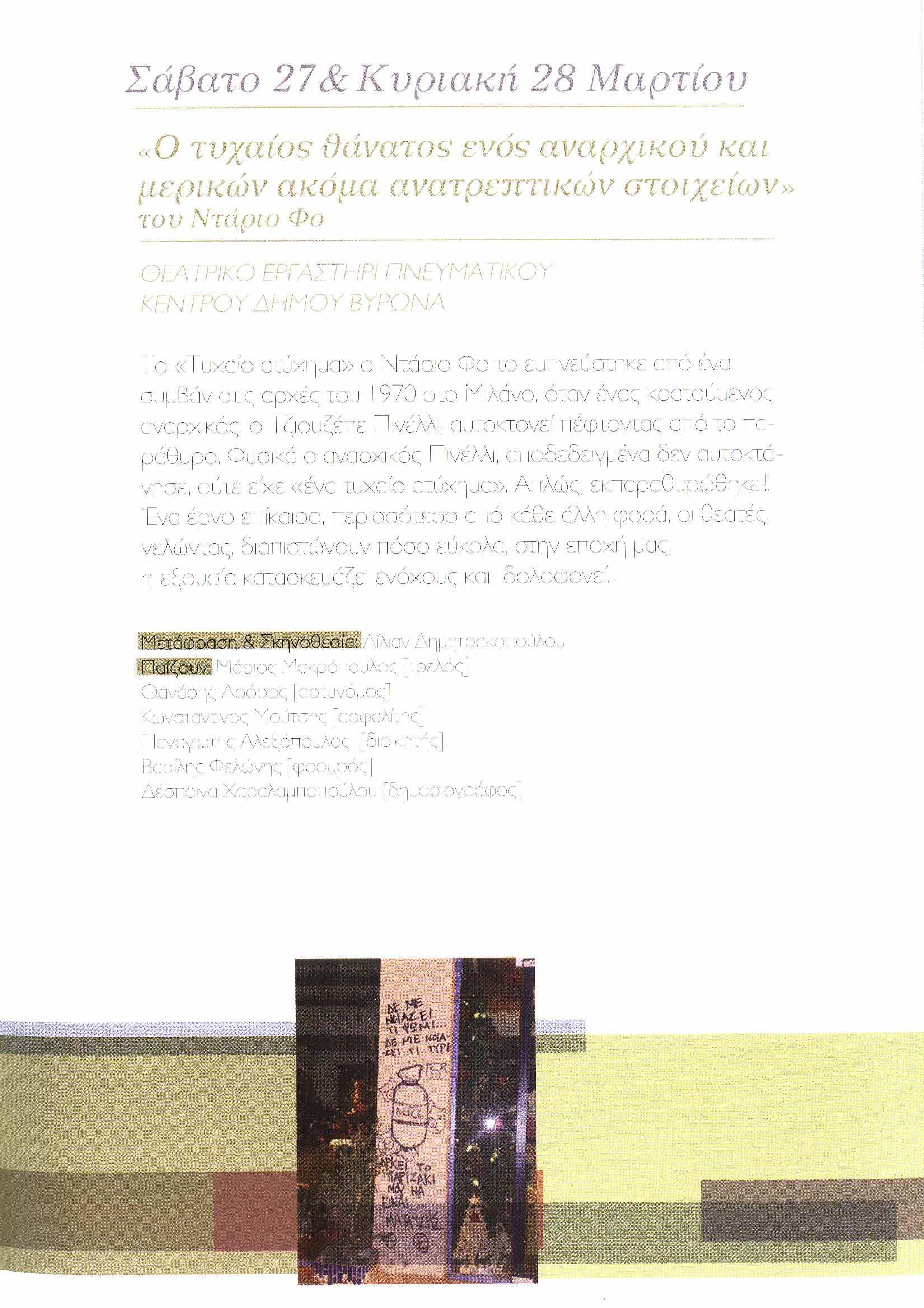 Το «Τυχαίο ατύχημα» ο Ντάρο Φο το εμπνεύστηκε από ένα συμβάν στις αρχές ίου 1970 στο Μιλάνο, όταν ένας κρατούμενος αναρχικός, ο Τζιουζέπε Πινέλλι, αυτοκτονεί πέφτοντας από το παράθυρο. Φυσικά ο αναρχικός Πινέλλι, αποδεδειγμένα δεν αυτοκτό- νησε, ούτε είχε «ένα τυχαίο ατύχημα». Απλώς, εκπαραθυρώθηκε!!. Ένα έργο επίκαιρο, περισσότερο από κάθε άλλη φορά, οι θεατές, γελώντας, διαπιστώνουν πόσο εύκολα, στην εποχή μας, η εξουσία κατασκευάζει ενόχους και δολοφονεί.