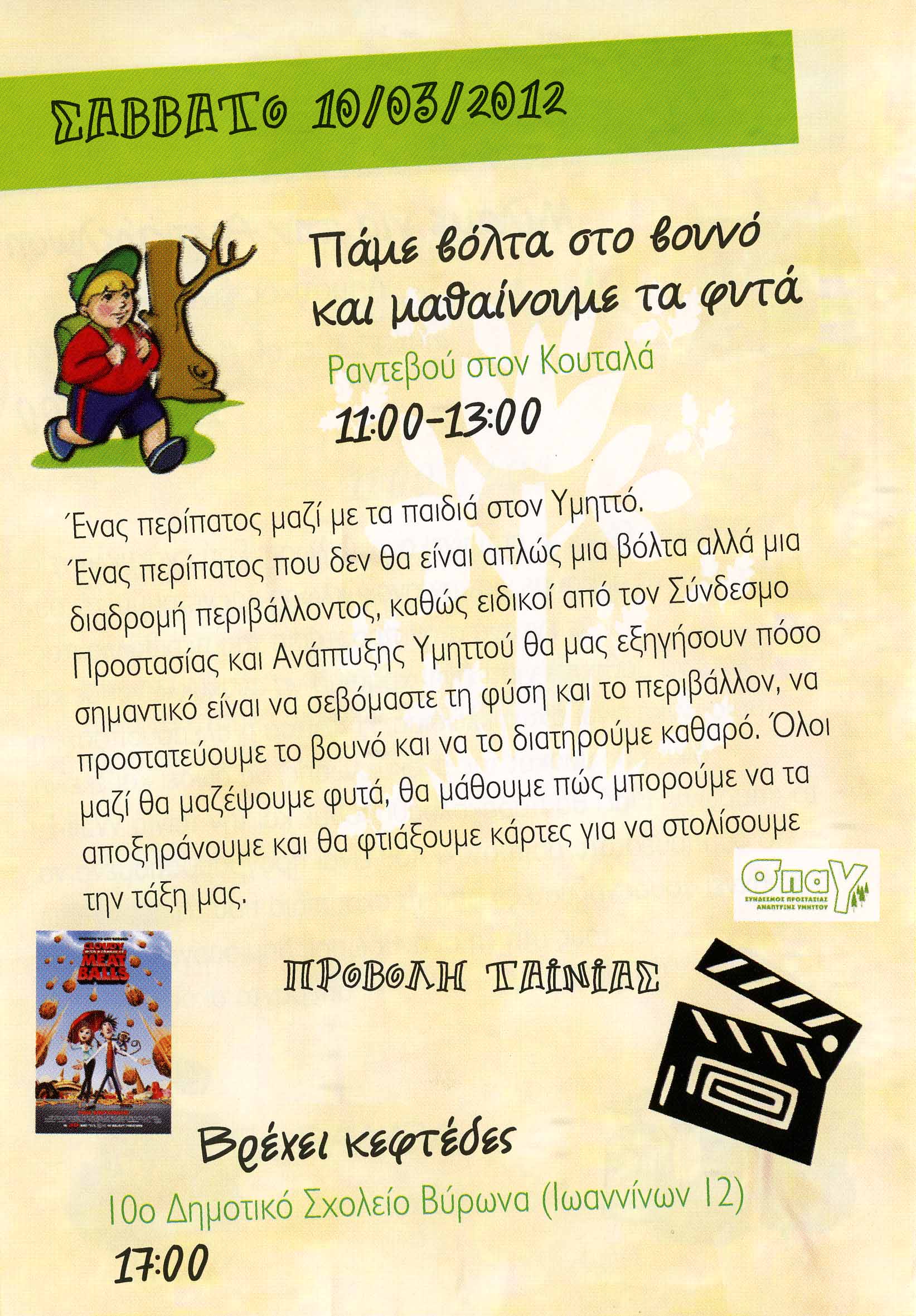 Ένας περίπατος μαζί με τα παιδιά στον Υμηττό. Ένας περίπατος που δεν θα είναι απλώς μια βόλτα αλλά μια διαδρομή περιβάλλοντος, καθώς ειδικοί από τον Σύνδεσμο Προστασίας και Ανάπτυξης Υμηττού θα μας εξηγήσουν πόσο σημαντικό είναι να σεβόμαστε τη φύση και το περιβάλλον, να προστατεύουμε το βουνό και να το διατηρούμε καθαρό. Όλοι μαζί θα μαζέψουμε φυτά, θα μάθουμε πώς μπορούμε να τα αποξηράνουμε και θα φτιάξουμε κάρτες για να στολίσουμε την τάξη μας.