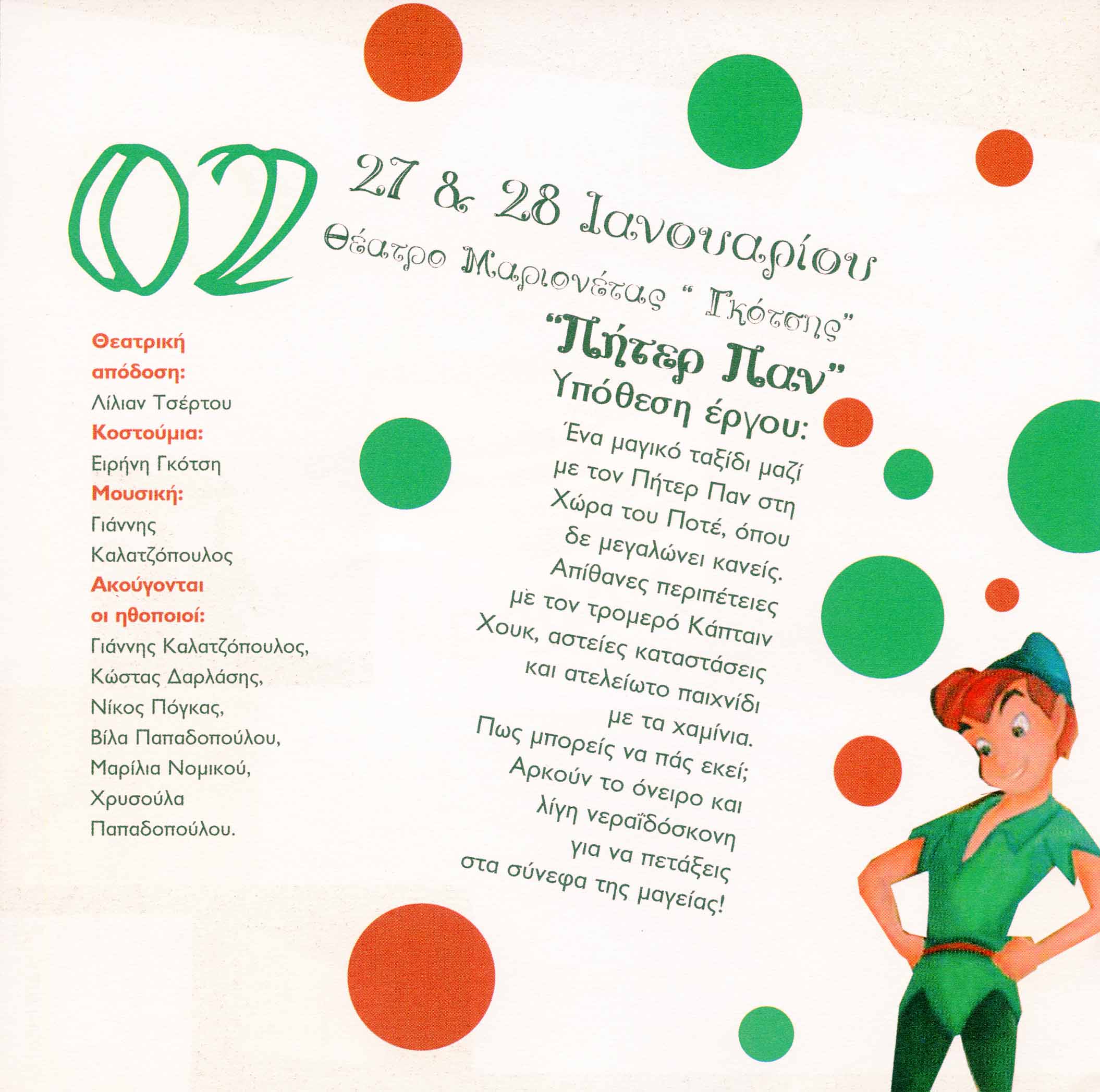 Ένα μαγικό ταξίδι μαζί με τον Πήτερ Παν στη Χώρα του Ποτέ, όπου δε μεγαλώνει κανείς. Απίθανες περιπέτειες με τον τρομερό Κάπταιν Χουκ, αστείες καταστάσεις και ατελείωτο παιχνίδι με τα χαμίνια. Πως μπορείς να πάς εκεί; Αρκούν το όνειρο και λίγη νεραΐδόσκονη για να πετάξεις στα σύννεφα της μαγείας!