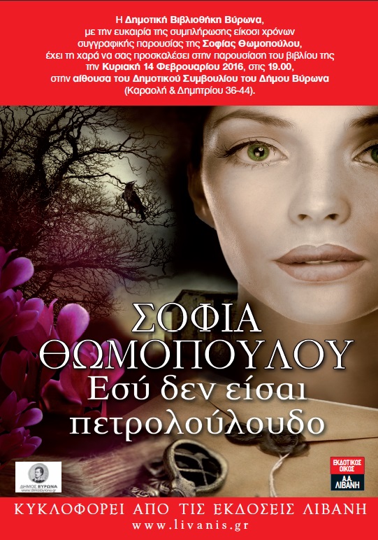 Η Δημοτική Βιβλιοθήκη Βύρωνα, σε συνεργασία με τις εκδόσεις “Λιβάνη”, έχουν τη χαρά, με την ευκαιρία συμπλήρωσης είκοσι ετών συγγραφικής παρουσίας της Σοφίας Θωμοπούλου, να σας προσκαλέσουν στην παρουσίαση του βιβλίου της, με τίτλο “Εσύ δεν είσαι Πετρολούλουδο”, την Κυριακή 14 Φεβρουαρίου 2016 και ώρα 7 μ.μ. στην αίθουσα του Δημοτικού Συμβουλίου του Δήμου Βύρωνα (Καραολή & Δημητρίου 36-44). Για το βιβλίο θα μιλήσουν η Κωνσταντίνα – Βικτωρία Γκολφινοπούλου, Φιλόλογος ΜΑ, ο Δημήτρης Σταμάτης, Λέκτορας Κλασικής Φιλολογίας στο Πανεπιστήμιο Κύπρου και η συγγραφέας. Αποσπάσματα από το βιβλίο θα διαβάσουν οι: Μαρία Φραγκιουδάκη, Στέλλα Λουρωτού και Λεωνίδας Μπόκαλης, μέλη του Θεατρικού Εργαστηρίου του Δήμου Βύρωνα.