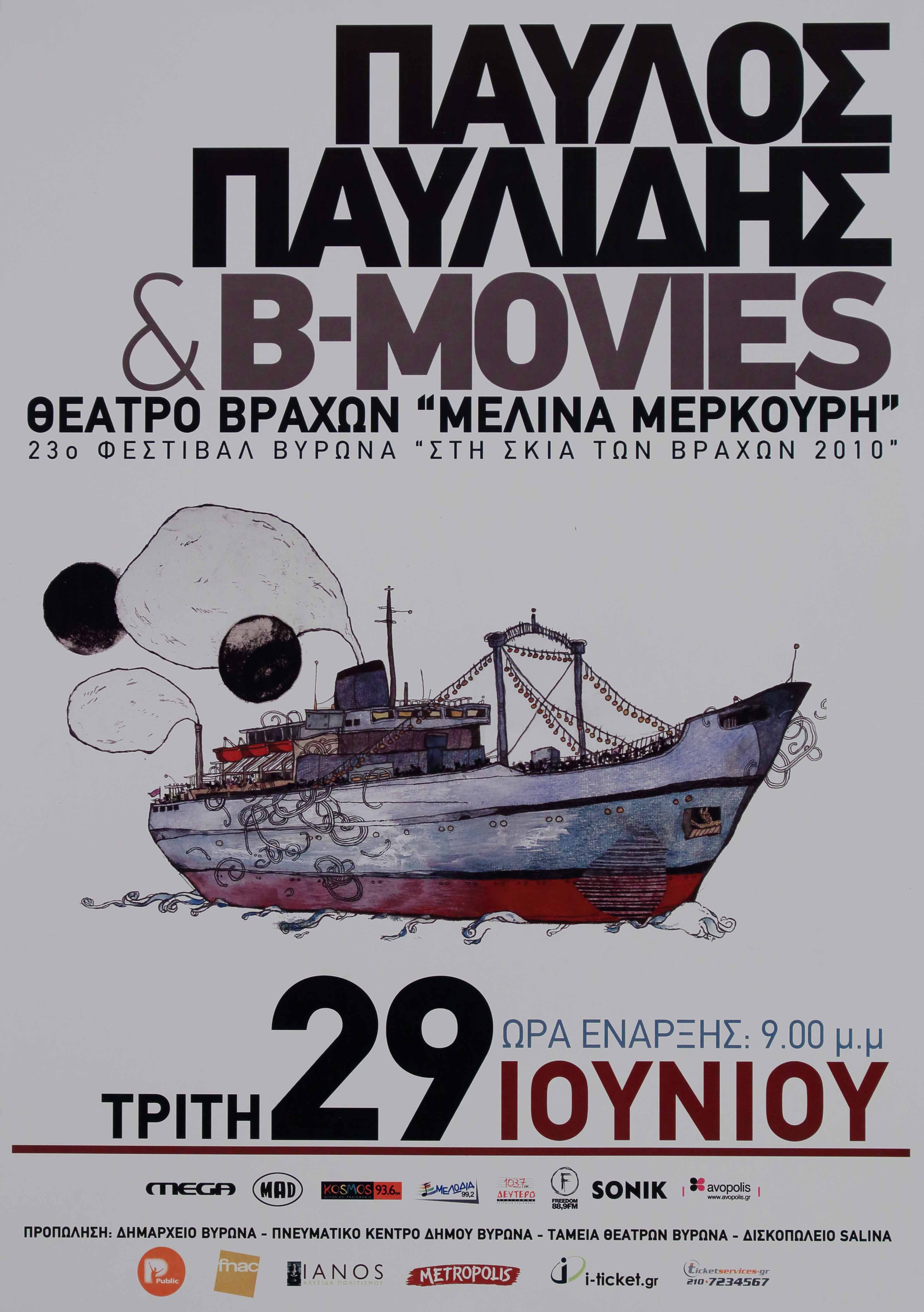 Ο Παύλος Παυλίδης και οι B-Movies υποδέχονται το καλοκαίρι με μια συναυλία στο Θέατρο Βράχων ≪Μελίνα Μερκούρη≫. Με φρέσκο υλικό από τον τελευταίο τους δίσκο με τίτλο ≪Αυτό Το Πλοίο Που Όλο Φτάνει≫ στις αποσκευές τους, ο Παύλος Παυλίδης και οι B-Movies θα παρουσιάσουν τα καινούργια, αλλά και τα κλασικά τους κομμάτια σε ένα μοναδικό live. Το ≪Αυτό Το Πλοίο Που Όλο Φτάνει≫ συγκαταλέγεται στις πιο φωτεινές και αισιόδοξες στιγμές του Παύλου Παυλίδη και ακούγεται σαν νοσταλγικό καλοκαιρινό ημερολόγιο με τις συναρπαστικές και μελωδικές ροκ συνθέσεις του. Εκτός από τα νέα αυτά τραγούδια, η βραδιά θα περιλαμβάνει και κλασικά αγαπημένα κομμάτια του Παύλου Παυλίδη όχι μόνο από την πορεία του με τους B-Movies, αλλά και από ακόμα πιο παλιά, από τις χρυσές ροκ μέρες των Ξύλινων Σπαθιών.