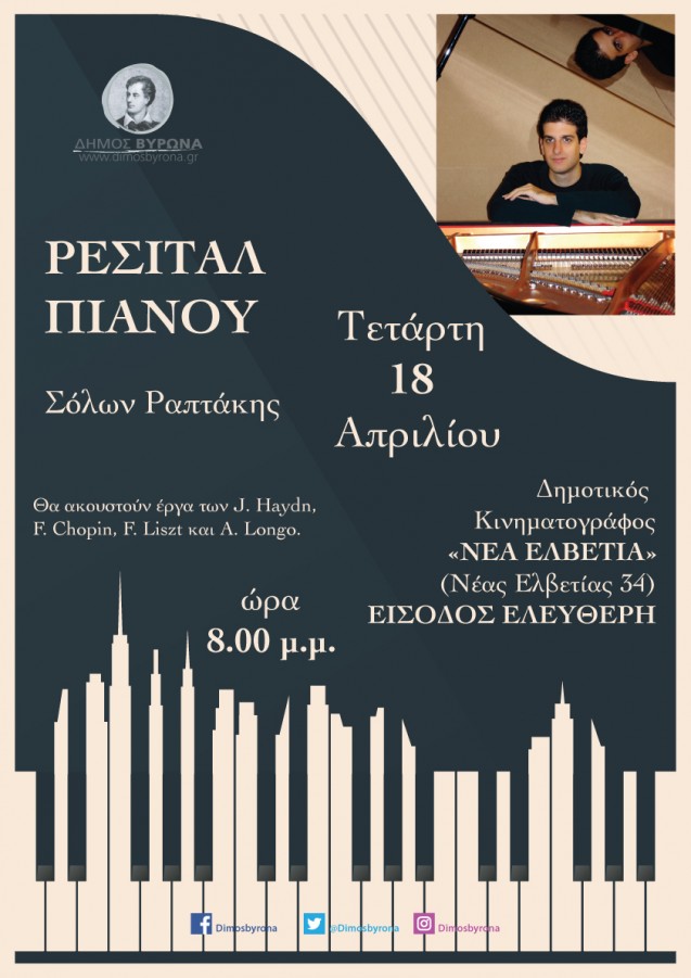 O Δήμος Βύρωνα έχει την χαρά και την τιμή να φιλοξενήσει τον καθηγητή πιάνου και μουσικολόγο Σόλων Ραπτάκη. Γεννημένος στον Βύρωνα, βραβευθείς σε πανελλήνιους μουσικούς διαγωνισμούς, παρουσιάζει ένα ρεσιτάλ πιάνου με ρεπερτόριο από τον κλασικισμό μέχρι και τον όψιμο ρομαντισμό. Θα ακουστούν έργα των J. Haydn, F. Chopin, F. Liszt και A. Longo.