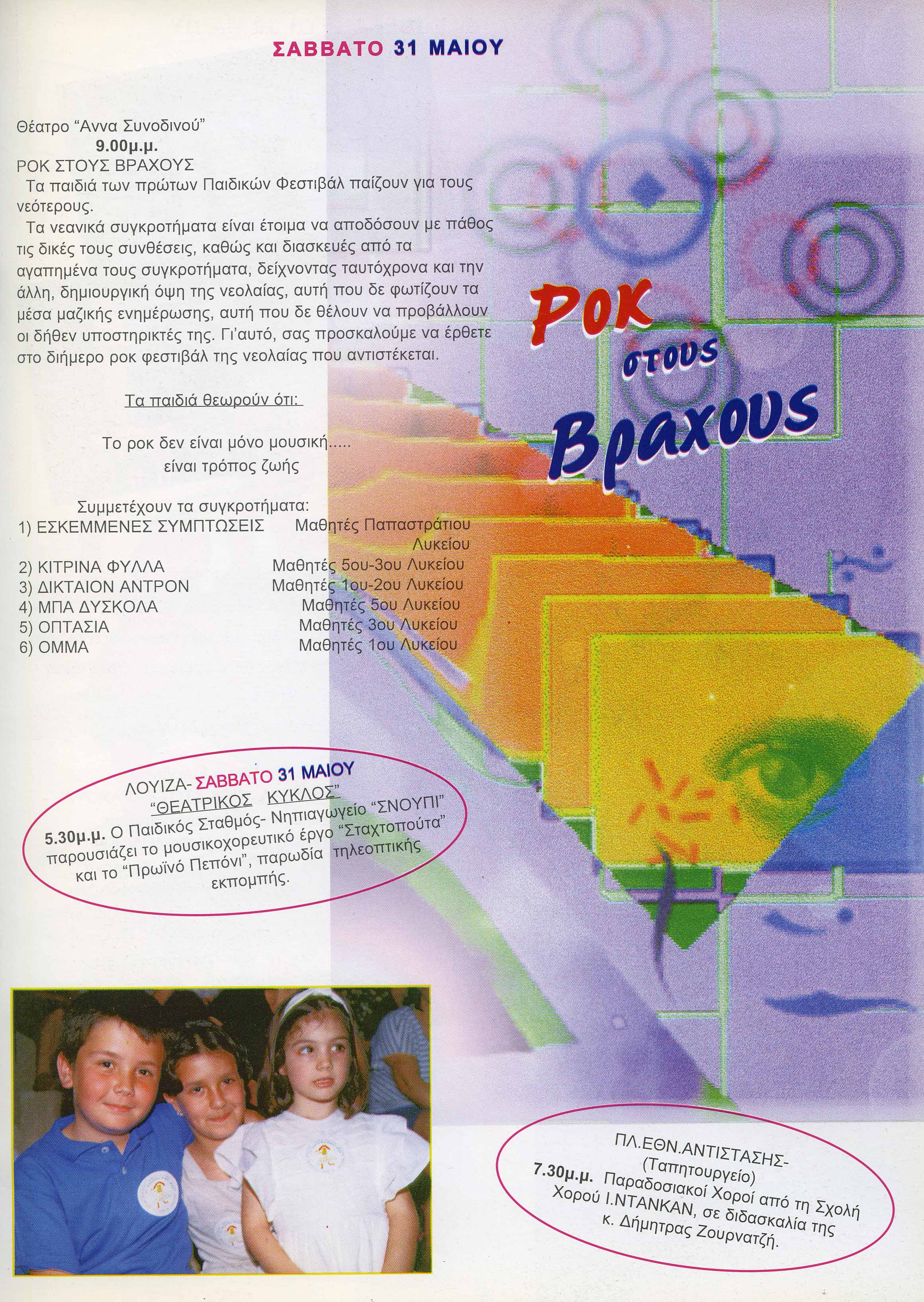 Τα παιδιά των πρώτων Παιδικών Φεστιβάλ παίζουν για τους νεότερους. Τα νεανικά συγκροτήματα είναι έτοιμα να αποδόσουν με πάθος τις δικές τους συνθέσεις, καθώς και διασκευές από τα αγαπημένα τους συγκροτήματα, δείχνοντας ταυτόχρονα και την άλλη, δημιουργική όψη της νεολαίας, αυτή που δε φωτίζουν τα μέσα μαζικής ενημέρωσης, αυτή που δε θέλουν να προβάλλουν οι δήθεν υποστηρικτές της. Γι’αυτό, σας προσκαλούμε να έρθετε στο διήμερο ροκ φεστιβάλ της νεολαίας που αντιστέκεται