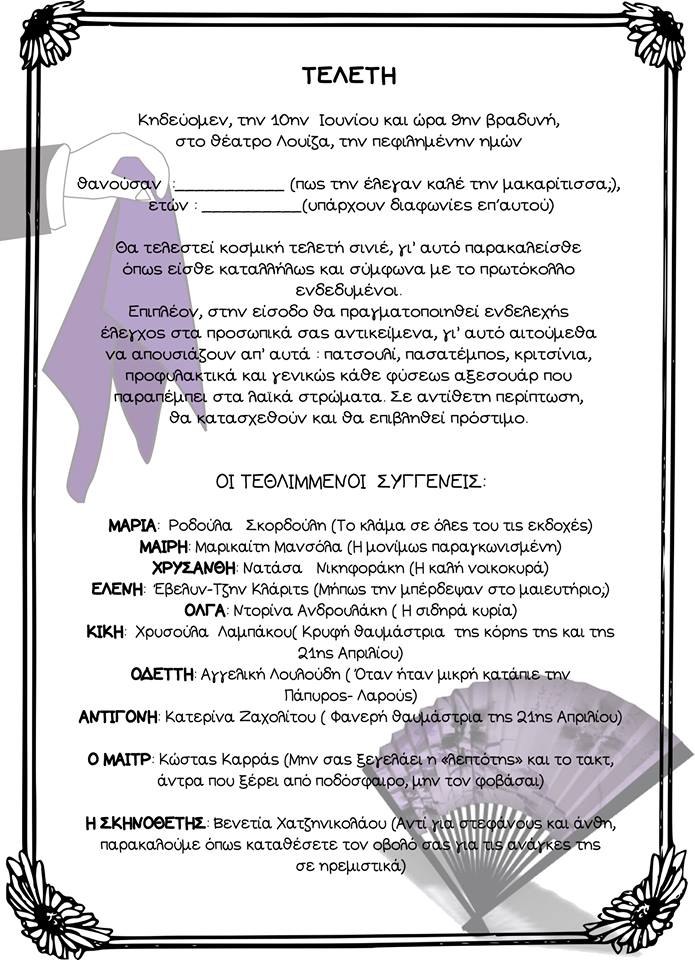 Ο ΜΑΙΤΡ- Κώστας Καρράς (Μην σας ξεγελάει η «λεπτότης» και το τακτ, άντρα που ξέρει από ποδόσφαιρο, μην τον φοβάσαι) Η ΣΚΗΝΟΘΕΤΗΣ – Βενετία Χατζηνικολάου (Αντί για στεφάνους και άνθη, παρακαλούμε όπως καταθέσετε τον οβολό σας για τις ανάγκες της σε ηρεμιστικά)
