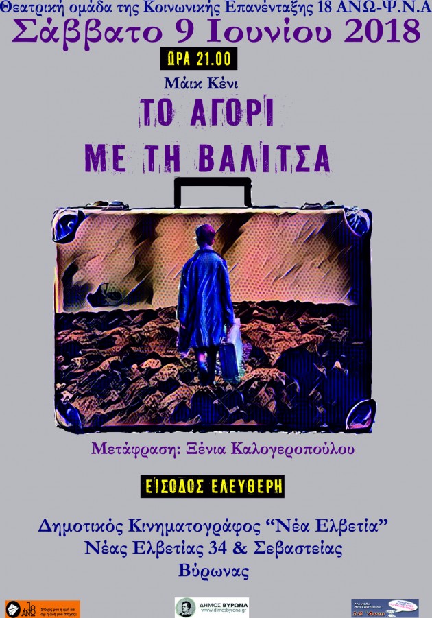 Η Θεατρική Ομάδα της Κοινωνικής Επανένταξης 18 ΑΝΩ – Ψ.Ν.Α, παρουσιάζει τη θεατρική παράσταση «ΤΟ ΑΓΟΡΙ ΜΕ ΤΗ ΒΑΛΙΤΣΑ» (του Μαϊκ Κένι ), σε μετάφραση Ξένιας Καλογεροπούλου, το Σάββατο 9 Ιουνίου, στις 21.00, στον Δημοτικό Κινηματογράφο “Νέα Ελβετία”, Νέας Ελβετίας 34 & Σεβαστείας. ΕΙΣΟΔΟΣ ΕΛΕΥΘΕΡΗ.