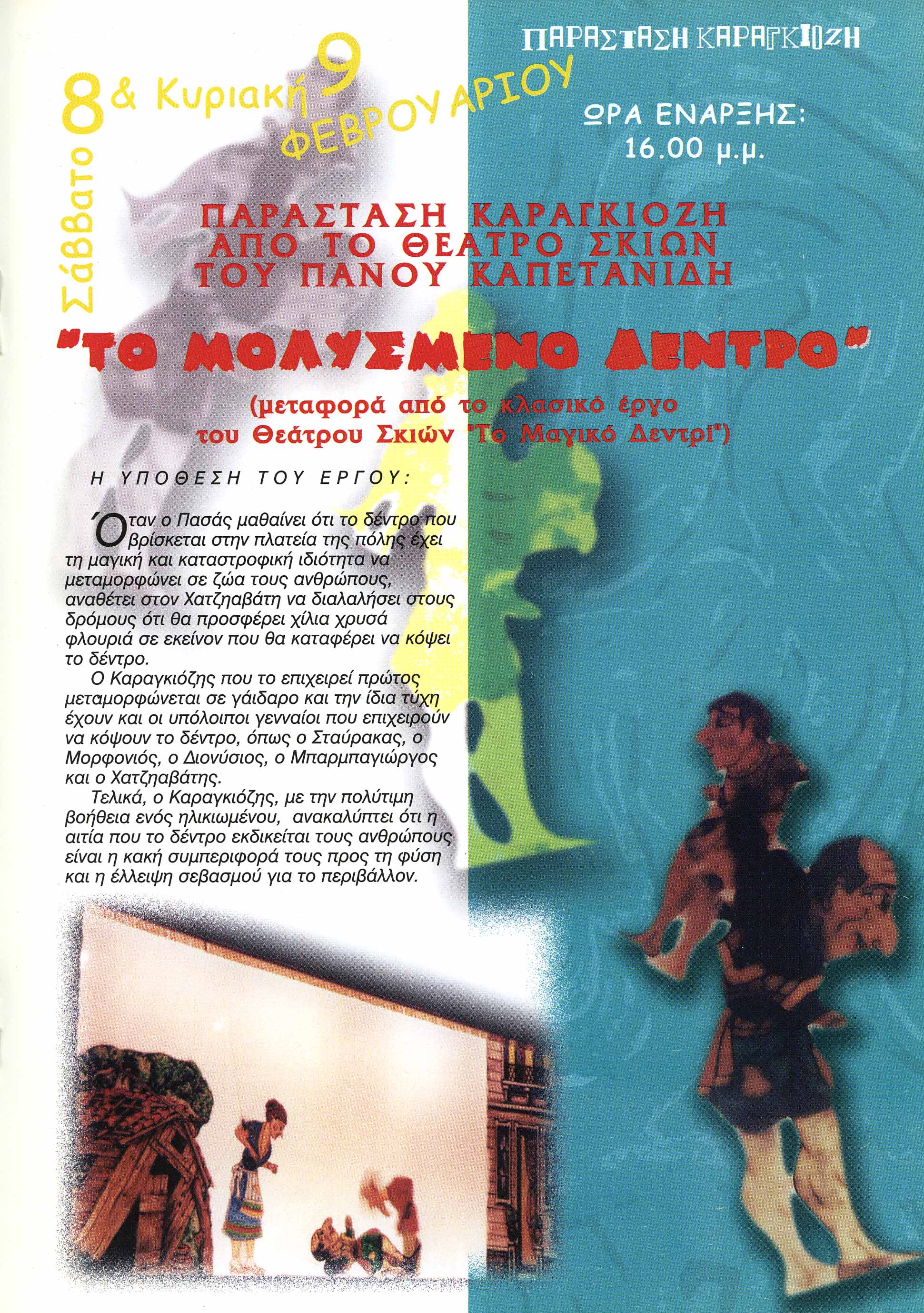 Ο Πασάς ανακαλύπτοντας μια μέρα ότι το δέντρο που είναι στην πλατεία της πόλης έχει αποκτήσει μαγικές ιδιότητες και μεταμορφώνει τους ανθρώπους σε ζώα, αναθέτει στον Χατζηαβάτη να ντελαλήσει ότι όποιος καταφέρει να κόψει το μολυσμένο δέντρο, θα πάρει χίλια χρυσά φλουριά. Πρώτος πάει ο Καραγκιόζης, αλλά στην προσπάθεια του να κόψει το δέντρο, μεταμορφώνεται σε ...γάϊδαρος. Το ίδιο μεταμορφώνεται και όλη η παρέα του: Ο Σταύρακας, ο Μορφονιός, ο Διονύσιος ο Μπαρμπαγιώργος, ακόμα και ο Χατζηαβάτης. Στο τέλος, και με την βοήθεια ενός ηλικιωμένου, ο Καραγκιόζης ανακαλύπτει τον λόγο που το δέντρο εκδικείται τους ανθρώπους και τους μεταμορφώνει σε ζώα. Η φύση τιμωρεί τους ανθρώπους για την απροσεξία τους και την κακή συμπεριφορά τους προς το περιβάλλον. Και για να ξαναγίνουν όλα όπως πρώτα, ο Καραγκιόζης και η παρέα του, με την βοήθεια του κοινού, υπόσχονται στο δέντρο, και μέσ' απ' αυτό σ' ολόκληρη την φύση, ότι πια, θα είναι πιο προσεκτικοί με το περιβάλλον, βοηθώντας στην ανακύκλωση, στο να σώσουν τα δάση από τις φωτιές, στο να προστατέψουν τα πλάσματα της φύσης που κοντεύουν να εξαφανιστούν.