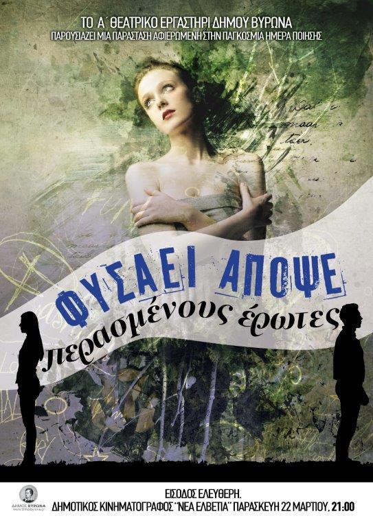 Το Α' θεατρικό εργαστήρι Δήμου Βύρωνα παρουσιάζει μια παράσταση αφιερωμένη στην παγκόσμια ημέρα ποίησης. Δημοτικός Κινηματογράφος 'ΝΕΑ ΕΛΒΕΤΙΑ' Παρασκευή 22 Μαρτίου, 21:00 Είσοδος ελεύθερη
