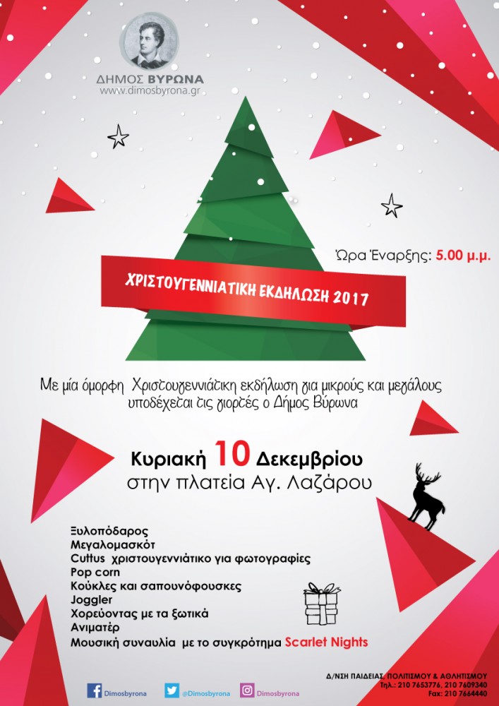 Χριστουγεννιάτικη Εκδήλωση του Δήμου Βύρωνα Με μία όμορφη Χριστουγεννιάτικη εκδήλωση για μικρούς και μεγάλους υποδέχεται τις γιορτές ο Δήμος Βύρωνα την Κυριακή 10 Δεκεμβρίου 2017, στην Πλατεία Αγ. Λαζάρου. Ώρα έναρξης της εκδήλωσης: 5.00 μ.μ. Το εορταστικό πρόγραμμα περιλαμβάνει: Ξυλοπόδαρο Μεγαλομασκότ Κούκλες και σαπουνόφουσκες Joggler Xορό με τα ξωτικά Cuttus χριστουγεννιάτικο για φωτογραφίες Pop corn Ανιματέρ Μουσική συναυλία με το συγκρότημα Scarlet Nights Ελάτε να γιορτάσουμε μαζί το χαρμόσυνο μήνυμα των Χριστουγέννων!