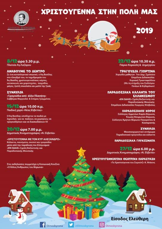8/12 ώρα 5.30 μ .μ. Πλατεία Αγ. Λαζάρου ΑΝΑΒΟΥΜΕ ΤΟ ΔΕΝΤΡΟ. Σε ένα καταπληκτικό σκηνικό, ο Αη Βασίλης στο έλκηθρό του, το ταχυδρομείο του Αη Βασίλη, χριστουγεννιάτικες κάρτες, κατασκευές και χειροτεχνίες, παιχνίδια, μάγος, ζεστή σοκολάτα και μαλλί της Γριάς. ΣΥΝΑΥΛΙΑ. 'Τραγούδια από άλλο Πλανήτη' Σαββέρια Μαργιολά & Σπύρος Γραμμένος 15/12 ώρα 10.00 π.μ. Παιδική χαρά 'Νέας Ελβετίας' Ο Άη Βασίλης υποδέχεται τα παιδιά με λιχουδιές για να παίξουν, να χορέψουν, να τραγουδήσουν και να διασκεδάσουν!!!! 20/12 ώρα 7.00 μ.μ. Δημοτικός Κινηματογράφος 'Ν. Ελβετία' 'ΧΡΙΣΤΟΥΓΕΝΝΑ ΜΕ ΤΟΝ ΚΥΡ ΑΛΕΞΑΝΔΡΟ' Κάλαντα, παινέματα, σκοποί και τραγούδια μέσα από την παράδοση του Ελληνισμού. 'Εν Ωδαίς' Σχολή Βυζαντινής και Παραδοσιακής Μουσικής 22/12 ώρα 10.30 π. μ. Πάρκο Καραολή & Δημητρίου ΤΡΑΓΟΥΔΙΑ ΓΙΟΡΤΙΝΑ Χορωδία μαθητών 7ου Δημ. Σχολείου. Επιμέλεια Διδασκαλία: Κυριακή Τριανταφύλλου (Με τη στήριξη του Συλλόγου Γονέων & Κηδεμόνων) ΠΑΡΑΔΟΣΙΑΚΑ ΚΑΛΑΝΤΑ ΤΟΥ ΕΛΛΗΝΙΣΜΟΥ 'Εν Ωδαίς' Σχολή Βυζαντινής και Παραδοσιακής Μουσικής. Επιμέλεια Διδασκαλία: Γεώργιος Ντόβολος ΠΑΡΑΔΟΣΙΑΚΟΙ ΧΟΡΟΙ Σύλλογος Αρμενίων Καρέα Βύρωνα, Ένωση Ηπειρωτών Βύρωνα, Σύλλογος Κρητών Βύρωνα-Παγκρατίου & Καισαριανής ΣΥΝΑΥΛΙΑ Μουσικοχορευτικό αντάμωμα. Παραδοσιακά τραγούδια και κάλαντα. ΠΑΡΑΔΟΣΙΑΚΑ ΓΛΥΚΙΣΜΑΤΑ 27/12 ώρα 6.00 μ .μ. Δημοτικός Κινηματογράφος 'Ν. Ελβετία' ΧΡΙΣΤΟΥΓΕΝΝΙΑΤΙΚΗ ΘΕΑΤΡΙΚΗ ΠΑΡΑΣΤΑΣΗ 'Τα Χριστούγεννα του Σκρούτζ' Κ. Ντίκενς