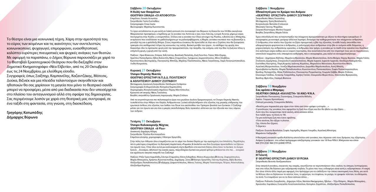 Φίλοι και φίλες, Η Αθήνα, λένε, είναι η πόλη με τα περισσότερα Θέατρα στον κόσμο, αναλογικά με τον πληθυσμό της. Ακόμα και την περίοδο της κρίσης, που οι επιχειρήσεις έκλειναν η μία μετά την άλλη, νέα θέατρα και μικροί θίασοι ξεφύτρωναν στις γειτονιές της. Οι Έλληνες αγαπούν το θέατρο. Ίσως γιατί ζουν στη χώρα που το γέννησε. Όχι μόνο ως θεατές, όμως. Παράλληλα με το εμπορικό θέτρο πληθαίνουν και οι ερασιτεχνικοί θίασοι. Μόνο ο Δήμος Βύρωνα έχει πλέον υπό την αιγίδα του 3 ερασιτεχνικές ομάδες και είμαστε πολύ περήφανοι που έχουμε τη δυνατότητα να το υποστηρίζουμε αυτό. Δημιουργήθηκε έτσι μια αναγκαιότητα: Η συνάντηση των ερασιτεχνικών θιάσων. Η ανταλλαγή ιδεών, κειμένων, εμπειριών και κοινού. Μ' αυτό το σκεπτικό, αποφασίσαμε να τολμήσουμε την πραγματοποίηση αυτού του φεστιβάλ. Το ονομάσαμε '1ο φεστιβάλ ερασιτεχνικού θεάτρου' γιατί ελπίζουμε σ' ένα 2ο. Και ποιος ξέρει; Αν το αγκαλιάσουμε όλοι ίσως να γίνει ακόμη θεσμός στα πολιτιστικά δρώμενα της πόλης μας. Λεμονιά Κλωνάρη, Αντιδήμαρχος Πολιτισμού, Παιδείας & Νέας Γενιάς