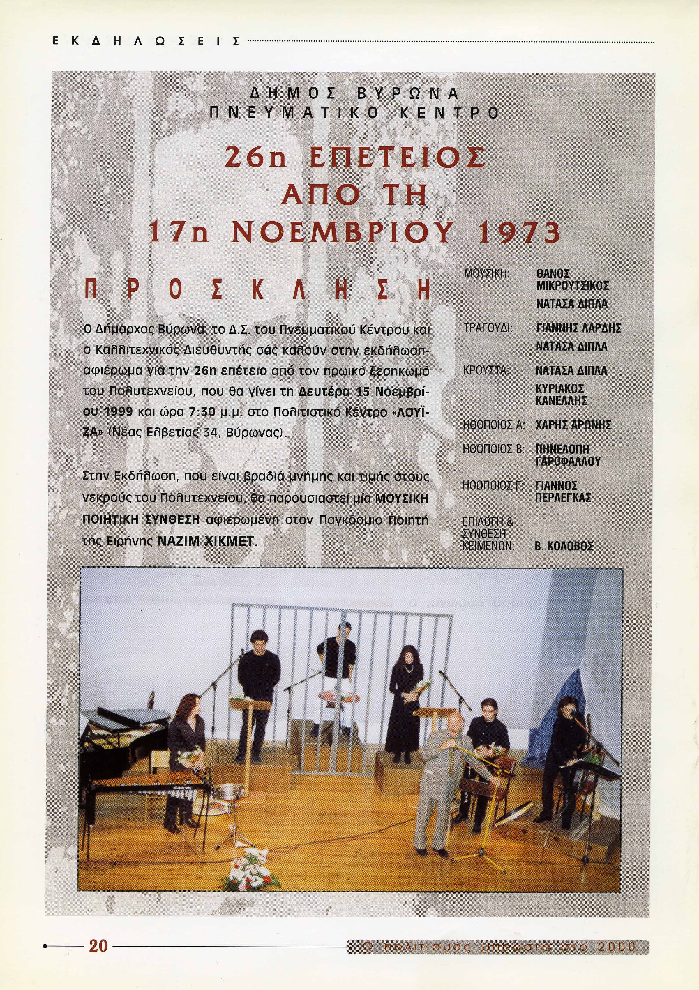 Στην Εκδήλωση, που είναι βραδιά μνήμης και τιμής στους νεκρούς του Πολυτεχνείου, θα παρουσιαστεί μία Μουσική ποιητική Σύνθεση αφιερωμένη στον Παγκόσμιο ποιητή της Ειρήνης Nαζίμ Χικμέτ.