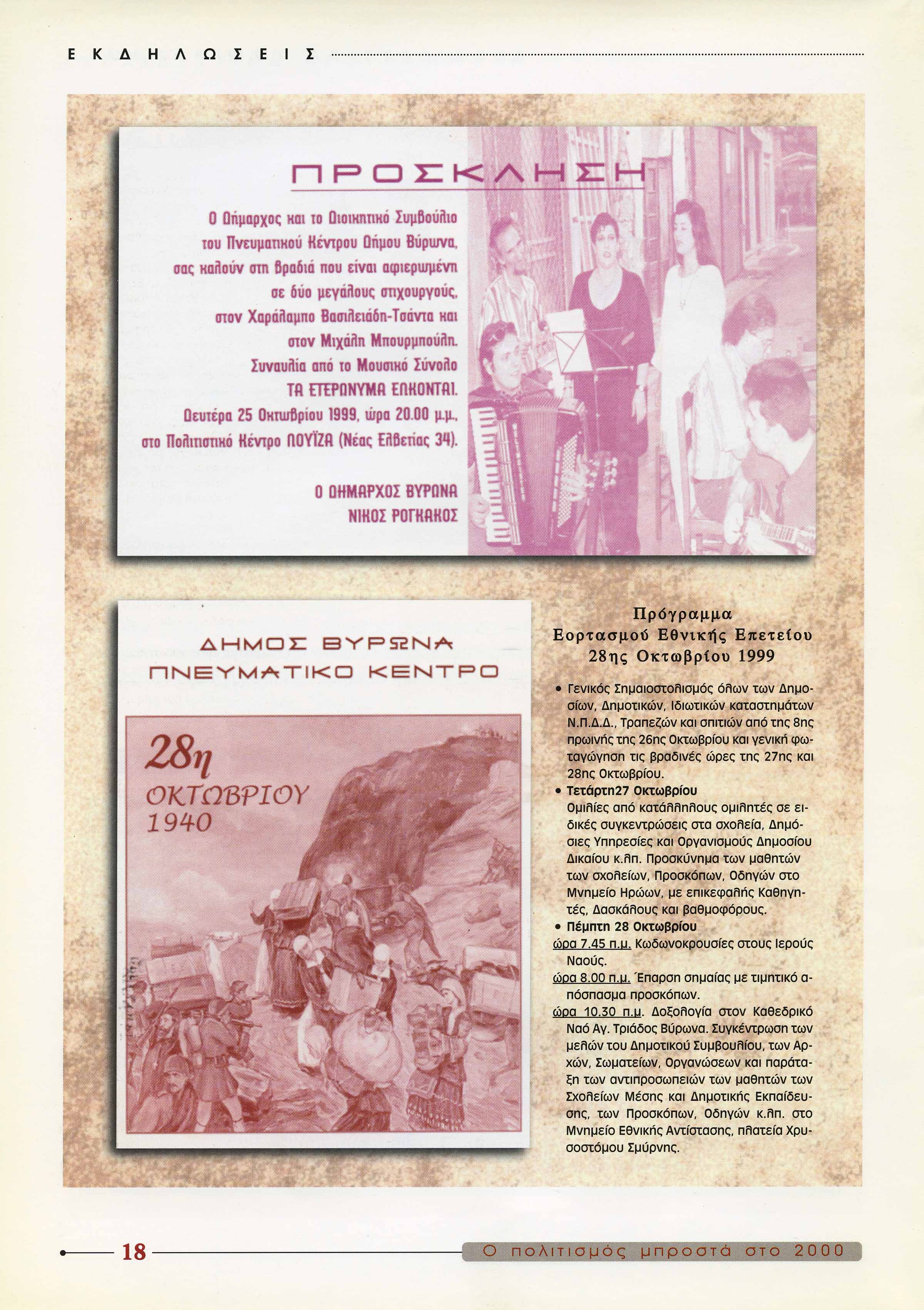 Γενικός Σημαιοστολισμός όλων των Δημοσίων, Δημοτικών, Ιδιωτικών καταστημάτων Ν.Π.Δ.Δ., Τραπεζών και σπιτιών από της 8ης πρωινής της 26ης Οκτωβρίου και γενική φωταγώγηση τις βραδινές ώρες της 27ης και 28ης Οκτωβρίου. • Τετάρτη27 Οκτωβρίου: Ομιλίες από κατάλληλους ομιλητές σε ειδικές συγκεντρώσεις στα σχολεία, Δημόσιες Υπηρεσίες και Οργανισμούς Δημοσίου Δικαίου κ.λπ. Προσκύνημα των μαθητών των σχολείων, Προσκόπων, Οδηγών στο Μνημείο Ηρώων, με επικεφαλής Καθηγητές, Δασκάλους και βαθμοφόρους. • Πέμπτη 28 Οκτωβρίου: ώρα 7.45 π.μ. Κωδωνοκρουσίες στους ιερούς Ναούς. ώρα 8.00 π.μ. Έπαρση σημαίας με τιμητικό απόσπασμα προσκόπων. ώρα 10.50 π.μ. Δοξολογία στον Καθεδρικό Ναό Αγ. Τριάδος Βύρωνα. Συγκέντρωση των μελών του Δημοτικού Συμβουλίου, των Αρχών, Σωματείων, Οργανώσεων και παράταξη των αντιπροσωπειών των μαθητών των Σχολείων Μέσης και Δημοτικής Εκπαίδευσης, των Προσκόπων, Οδηγών κ.λπ. στο Μνημείο Εθνικής Αντίστασης, πλατεία Χρυσοστόμου Σμύρνης.