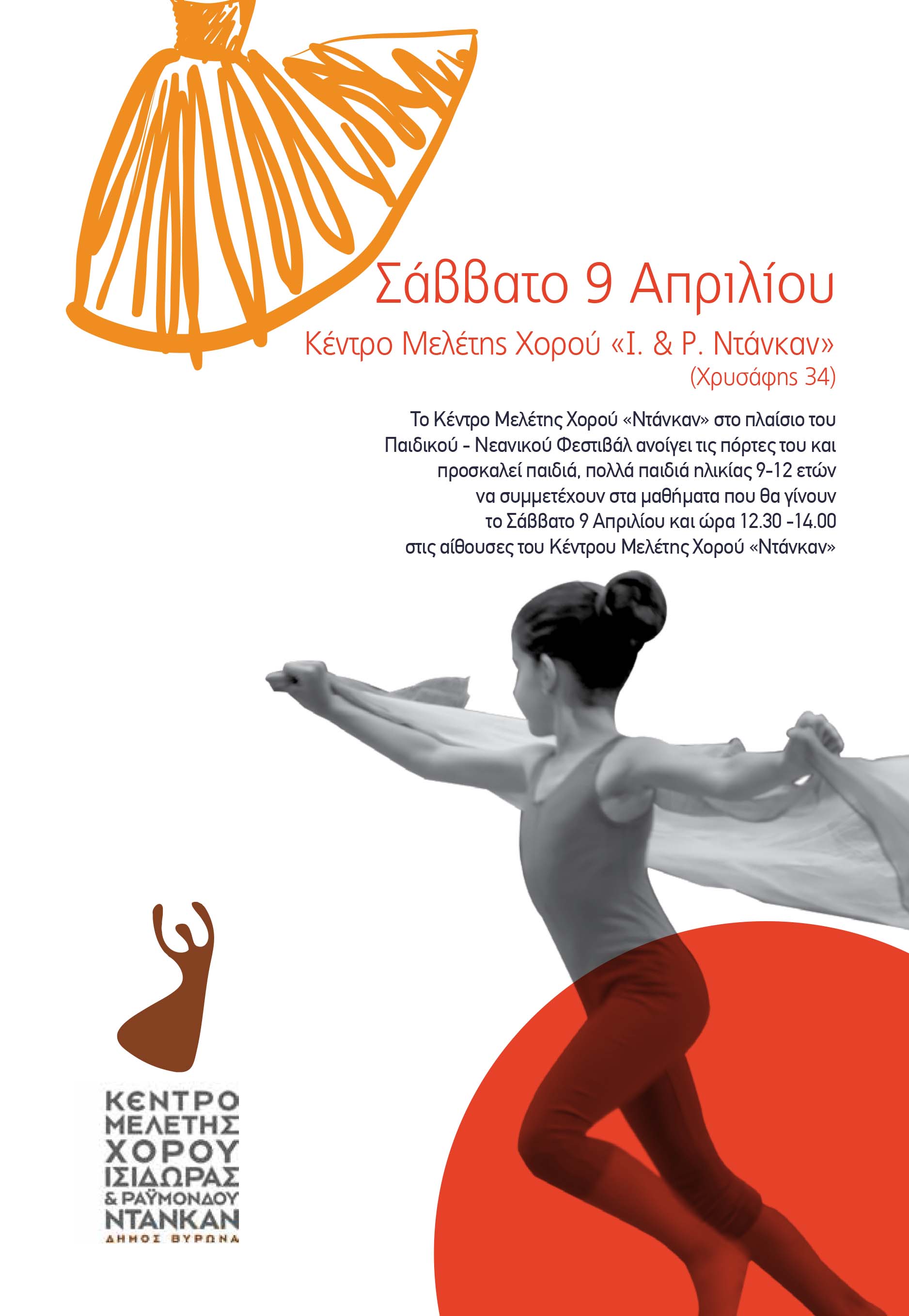 Το Κέντρο Μελέτης Χορού «Ντάνκαν» στο πλαίσιο του Παιδικού - Νεανικού Φεστιβάλ ανοίγει τις πόρτες του και προσκαλεί παιδιά, πολλά παιδιά ηλικίας 9-12 ετών να συμμετέχουν στα μαθήματα που θα γίνουν το Σάββατο 9 Απριλίου και ώρα 12.30 -14.00 στις αίθουσες του Κέντρου Μελέτης Χορού «Ντάνκαν»