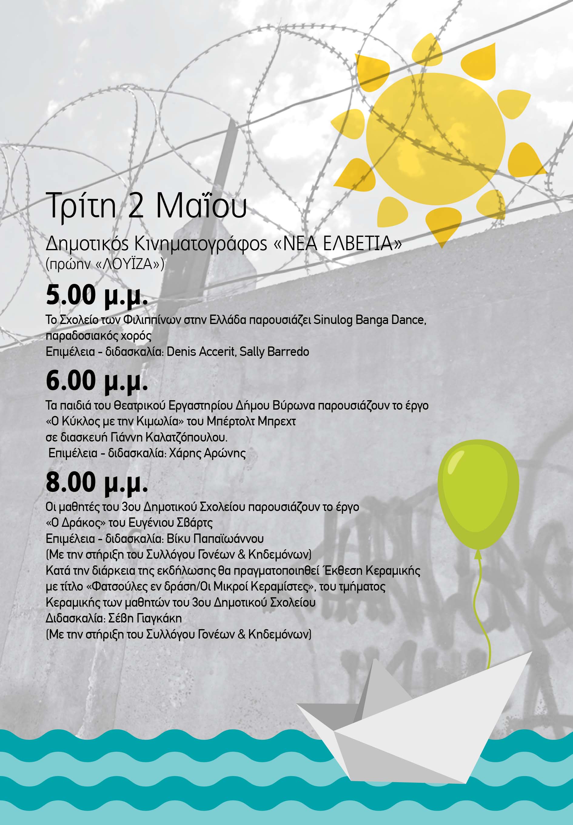 8.00 μ.μ. Οι μαθητές του 3ου Δημοτικού Σχολείου παρουσιάζουν το έργο «Ο Δράκος» του Ευγένιου Σβάρτς Επιμέλεια - διδασκαλία: Βίκυ Παπαϊωάννου (Με την στήριξη του Συλλόγου Γονέων & Κηδεμόνων) Κατά την διάρκεια της εκδήλωσης θα πραγματοποιηθεί Έκθεση Κεραμικής με τίτλο «Φατσούλες εν δράση/Οι Μικροί Κεραμίστες», του τμήματος Κεραμικής των μαθητών του 3ου Δημοτικού Σχολείου Διδασκαλία: Σέβη Γιαγκάκη (Με την στήριξη του Συλλόγου Γονέων & Κηδεμόνων)