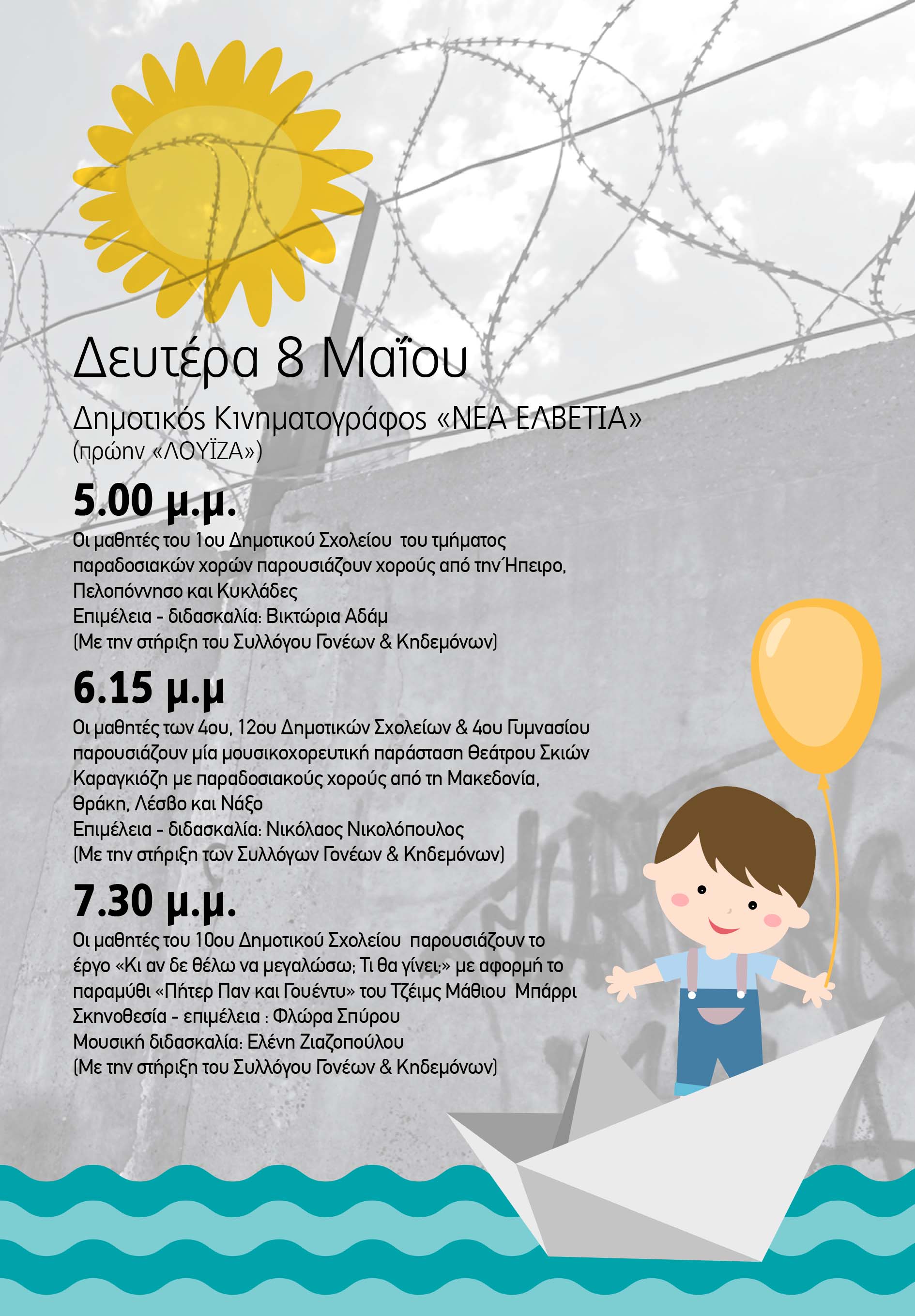7.30 μ.μ. Οι μαθητές του 10ου Δημοτικού Σχολείου παρουσιάζουν το έργο «Κι αν δε θέλω να μεγαλώσω; Τι θα γίνει;» με αφορμή το παραμύθι «Πήτερ Παν και Γουέντυ» του Τζέιμς Μάθιου Μπάρρι. Σκηνοθεσία - επιμέλεια : Φλώρα Σπύρου. Μουσική διδασκαλία: Ελένη Ζιαζοπούλου (Με την στήριξη του Συλλόγου Γονέων & Κηδεμόνων)