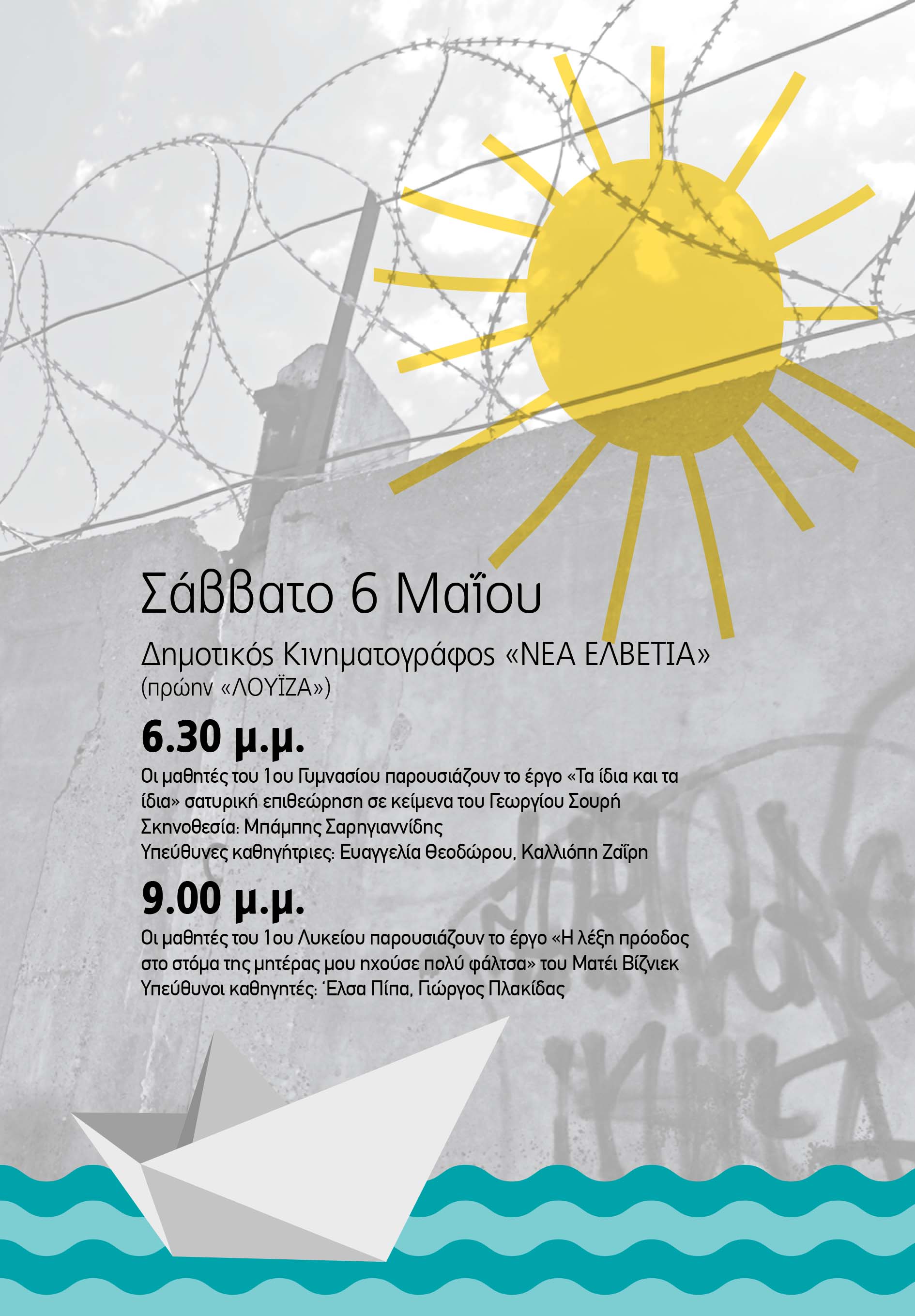 9.00 μ.μ. Οι μαθητές του 1ου Λυκείου παρουσιάζουν το έργο «Η λέξη πρόοδος στο στόμα της μητέρας μου ηχούσε πολύ φάλτσα» του Ματέι Βίζνιεκ. Υπεύθυνοι καθηγητές: ‘Ελσα Πίπα, Γιώργος Πλακίδας