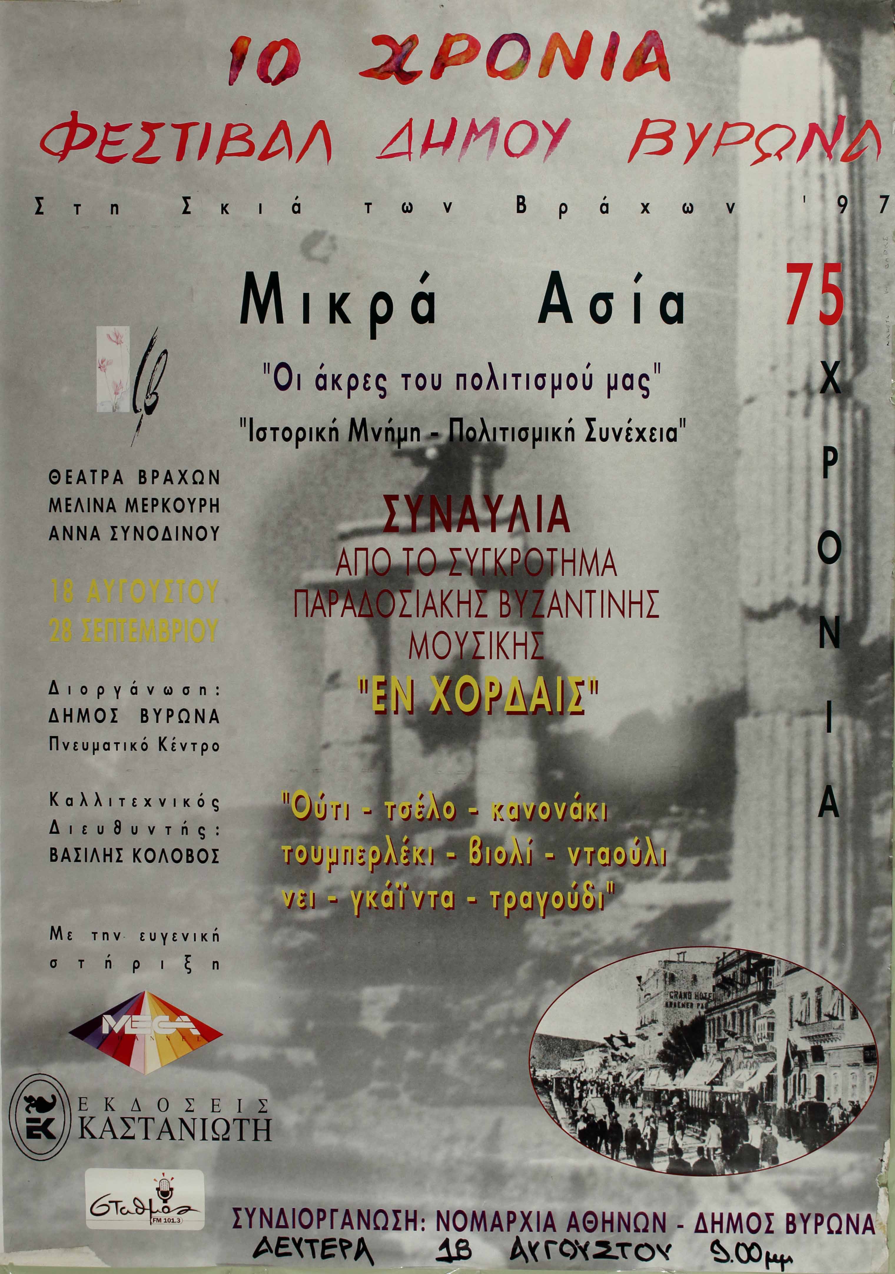 Φέτος, συμπληρώνονται 75 χρόνια από την καταστροφή της Μ. Ασίας. Εχουμε ζητήσει συνεργασία με τους Δήμους για να μπορέσουμε μέσα από κάποιες εκδηλώσεις να δώσουμε όλες τις διαστάσεις που έχει αυτή η επέτειος. Χαιρόμαστε που ο Δήμος Βύρωνα ανταποκρίθηκε και πήρε την απόφαση να διοργανώσει τιμητική εκδήλωση, συνδέοντας την επέτειο με την έναρξη του 10ου Φεστιβάλ Βύρωνα «στη σκιά των Βράχων '97», ενός Φεστιβάλ καταξιωμένου στη συνείδηση όχι μόνο της βυρωνιώτικης κοινωνίας, αλλά γενικότερα της κοινωνίας του αττικού λεκανοπέδιου. Η προσπάθεια μάλιστα να συνδεθεί η ιστορική μνήμη με την πολιτισμική συνέχεια χαρακτηρίζει την ανώτερη ποιότητα της πολιτιστικής δραστηριότητας που συντελείται στον Βύρωνα. Ο ΝΟΜΑΡΧΗΣ ΑΘΗΝΩΝ ΔΗΜΗΤΡΗΣ ΕΥΣΤΑΘΙΑΔΗΣ