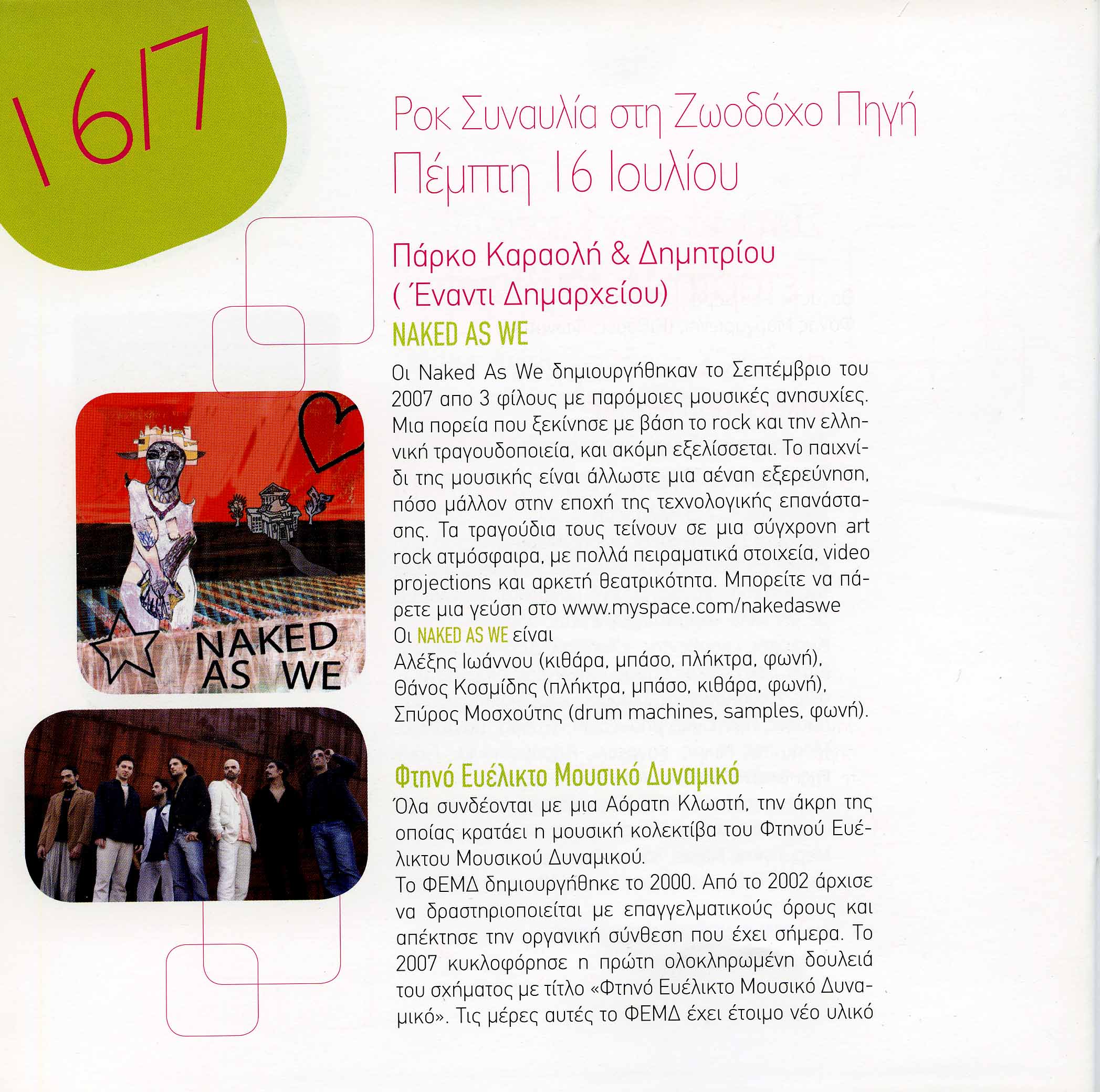 Οι Naked As We δημιουργήθηκαν το Σεπτέμβριο του 2007 απο 3 φίλους με παρόμοιες μουσικές ανησυχίες. Μια πορεία που ξεκίνησε με βάση το rock και την ελληνική τραγουδοποιεία, και ακόμη εξελίσσεται. Το παιχνίδι της μουσικής είναι άλλωστε μια αέναη εξερεύνηση, πόσο μάλλον στην εποχή της τεχνολογικής επανάστασης. Τα τραγούδια τους τείνουν σε μια σύγχρονη art rock ατμόσφαιρα, με πολλά πειραματικά στοιχεία, video projections και αρκετή θεατρικότητα. Φτηνό Ευέλικτο Μουοικό Δυναμικό: Όλα συνδέονται με μια Αόρατη Κλωστή, την άκρη της οποίας κρατάει η μουσική κολεκτίβα του Φτηνού Ευέλικτου Μουσικού Δυναμικού. Το ΦΕΜΔ δημιουργήθηκε το 2000. Από το 2002 άρχισε να δραστηριοποιείται με επαγγελματικούς όρους και απέκτησε την οργανική σύνθεση που έχει σήμερα. Το 2007 κυκλοφόρησε η πρώτη ολοκληρωμένη δουλειά του σχήματος με τίτλο 'Φτηνό Ευέλικτο Μουσικό Δυναμικό'. Τις μέρες αυτές το ΦΕΜΔ έχει έτοιμο νέο υλικό το οποίο αναμένεται να κυκλοφορήσει το 2009. Η χρήση video art θα αναλάβει την οπτικοποίηση των μουσικών συνειρμών. Ο δρόμος για το ελληνικό εγκεφαλικό rock είναι ανοιχτός. KYKLOI BAND: δημιουργήθηκαν από 4 φίλους επαγγελματίες μουσικούς, που δούλευαν μαζί χρόνια στο Σταυρό του Νότου. Ένα καινούργιο ξεκίνημα που θα έκαναν σ' ενα μικρό μαγαζί στο Παγκράτι που λεγόταν 'ΚΥΚΛΟΣ' πήραν και το όνομα. Συνεργάστηκαν με το Μιχάλη Κακέπη, το Γιώργο Τετζεράκη, τη Σοφία Βόσσου μέχρι που βρήκαν το μόνιμο τραγουδιστή τους που έδωσε και άλλο νόημα στο σχήμα το Γιώργο Μιχαήλ! Το καλοκαίρι δίνουν συναυλίες σε όλη την Ελλάδα! Όλα συνδέονται...